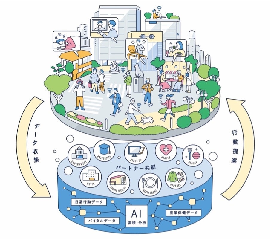 拠点となるオフィスの近くに産業保健活動や従業員の健康増進のサポートを行う“リアルの場”を提供し、健康増進サービスとデータ利活用・連携を行うことで、より効果的な健康支援施設をめざします。第1弾の実装エリアは渋谷とし、2023年度の実装を予定しています。
