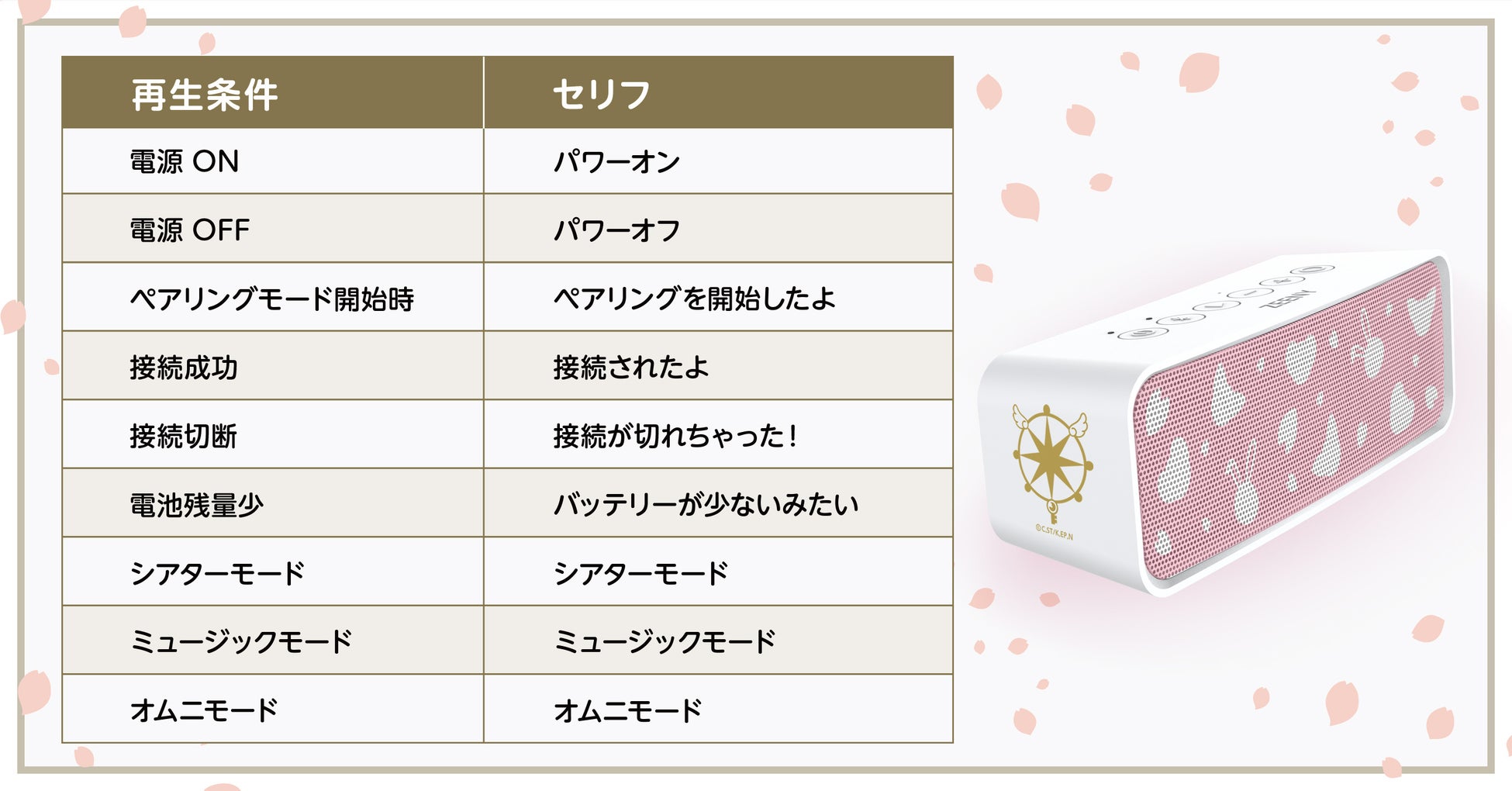 コラボレーションイヤフォン、スピーカーは、操作音を「木之本桜」(CV:丹下桜)の声でアナウンスします。「電源オン」「電源オフ」などの操作音の他に、アプリと連携すると聞くことができる「シークレットボイス」も搭載されております。