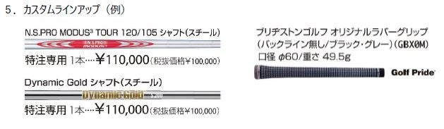 カスタムメイド専用モデルで、Dynamic Gold、及びN.S.PRO MODUS3 TOUR120/105シャフト装着時の 参考価格は、110,000円(税抜価格100,000円)です。