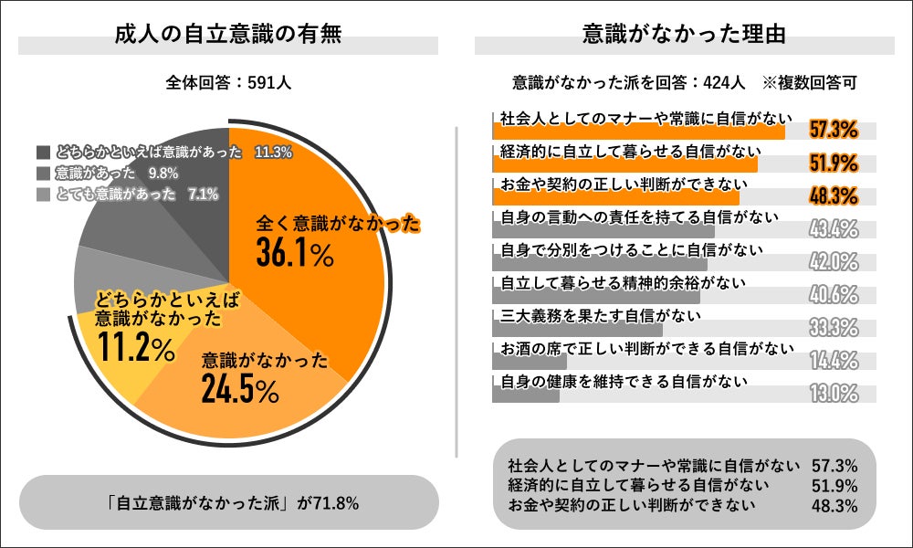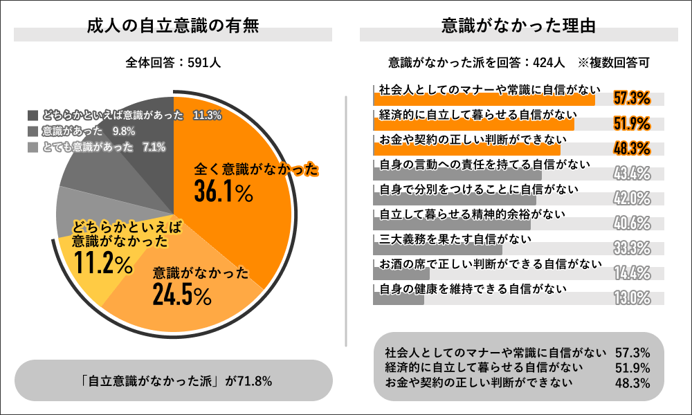 回答者全体の591人に成人の自立意識の有無を聞くと、「意識がなかった派」は71.8%で過半数を占め、内訳は「全く意識がなかった」36.1%、「意識がなかった」24.5%、「どちらかといえば意識がなかった」11.2%でした。意識がなかったと回答した424人にその理由を聞くと、「社会人としてのマナーや常識に自信がない」が57.3%で最多となり、次いで「経済的に自立して暮らせる自信がない」が51.9%、「お金や契約の正しい判断ができない」が48.3%と、上位3つの回答となりました。
