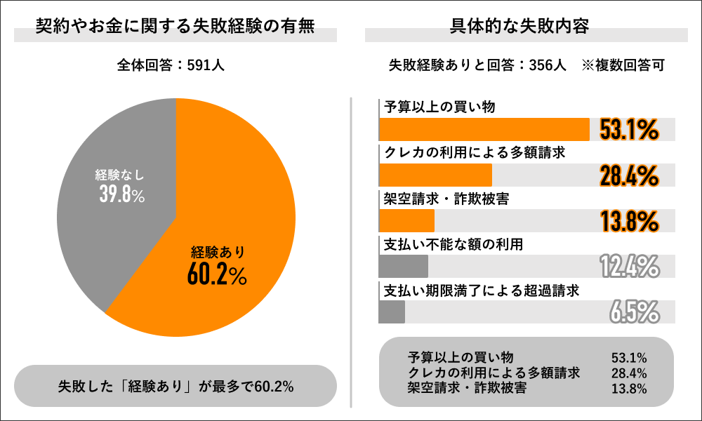回答者全体の591人に契約やお金に関する失敗経験の有無を聞くと、「経験あり」が60.2%で過半数を占め、「経験なし」は39.8%でした。失敗があると回答した356人に具体的な失敗内容を聞くと「予算以上の買い物」が53.1%で最多となり、次いで「クレジットカードの利用による多額請求」が28.4%、「架空請求・詐欺被害」が13.8%と、上位3つの回答となりました。