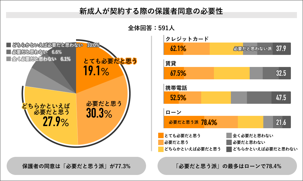 回答者全体の591人に新成人の契約時の保護者同意の必要性を聞くと「必要だと思う派」は77.3%で過半数を占め、内訳は「とても必要だと思う」19.1%、「必要だと思う」30.3%、「どちらかといえば必要だと思う」27.9%でした。同回答者にクレジットカード・賃貸・携帯電話・ローンのそれぞれの保護者同意の必要性を聞くと、全項目において「必要だと思う派」が過半数を占め、特に、ローンの「必要だと思う派」が78.4%で最多となりました。