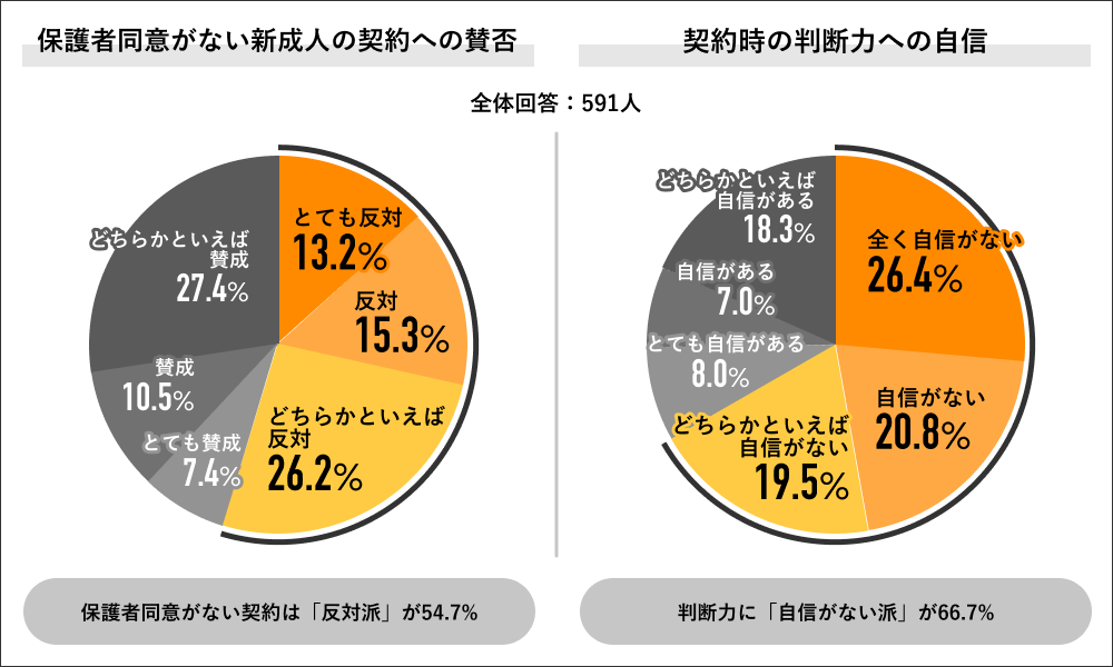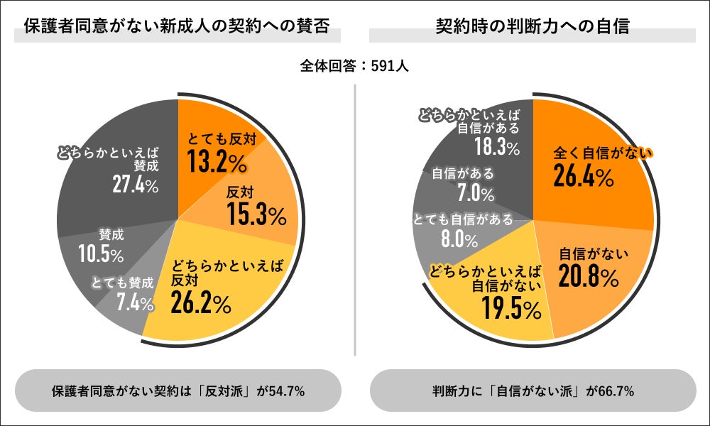 回答者全体の591人に保護者同意がない新成人の契約への賛否を聞くと「反対派」が54.7%で過半数を占め、内訳は「とても反対」13.2%、「反対」15.3%、「どちらかといえば反対」26.2%でした。同回答者に契約時の判断力への自信について聞くと「自信がない派」は66.7%で過半数を占め、内訳は「全く自信がない」26.4%、「自信がない」20.8%、「どちらかといえば自信がない」19.5%でした。