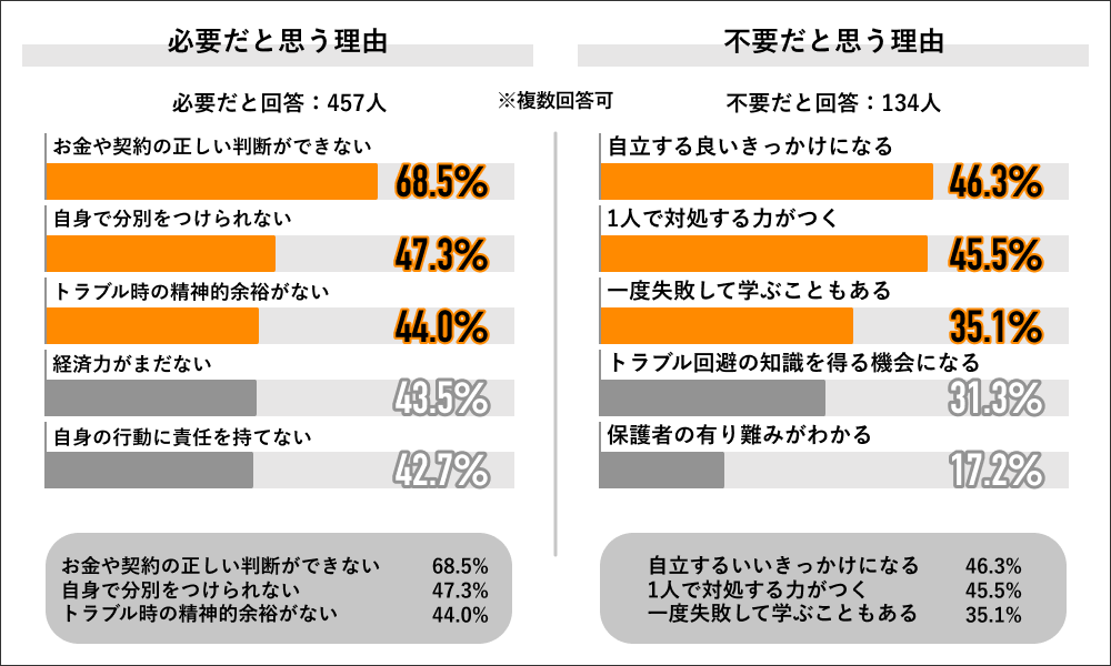 新成人の契約時に保護者の同意は必要と回答した457人にその理由を聞くと「お金や契約の正しい判断ができない」が68.5%で最多となり、次いで「自身で分別をつけられない」が47.3%、「トラブル時の精神的余裕がない」が44.0%と、上位3つの回答となりました。一方、不要と回答した134人にその理由を聞くと「自立する良いきっかけになる」が46.3%で最多となり、次いで「1人で対処する力がつく」が45.5%、「一度失敗して学ぶこともある」が35.1%と、上位3つの回答となりました。