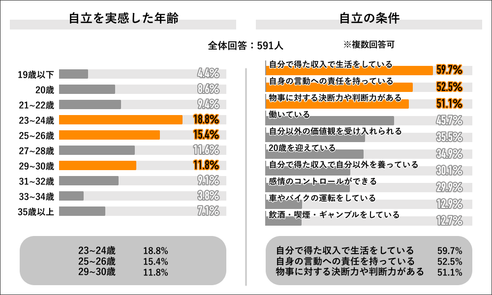 回答者全体の591人に自立を実感した年齢を聞くと「23~24歳」が18.8%で最多となり、次いで「25~26歳」が15.4%、「29~30歳」が11.8%と、上位3つの回答となりました。同回答者に自立の条件を聞くと「自分で得た収入で生活をしている」が59.7%で最多となり、次いで「自身の言動への責任を持っている」が52.5%、「物事に対する決断力や判断力がある」が51.1%、と、上位3つの回答となりました。