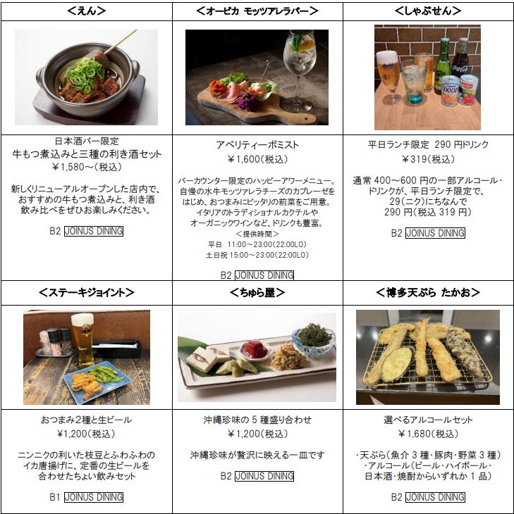 また、ジョイナスでは、その他にもちょい飲みメニューが続々!「オービカ モッツァレラバー」からは、おつまみにぴったりな前菜とドリンクを合わせた、バーカウンター限定のハッピーアワーメニューをご用意しております。「しゃぶせん」では、平日ランチ限定で29(ニク)にちなみドリンクを290円でご提供する他、「ステーキジョイント」からは、おつまみ2種と定番の生ビールを合わせたちょい飲みセット、沖縄料理の「ちゅら屋」からは、沖縄珍味を贅沢に楽しめる5種盛り合わせが登場。ぜひお見逃しなく!