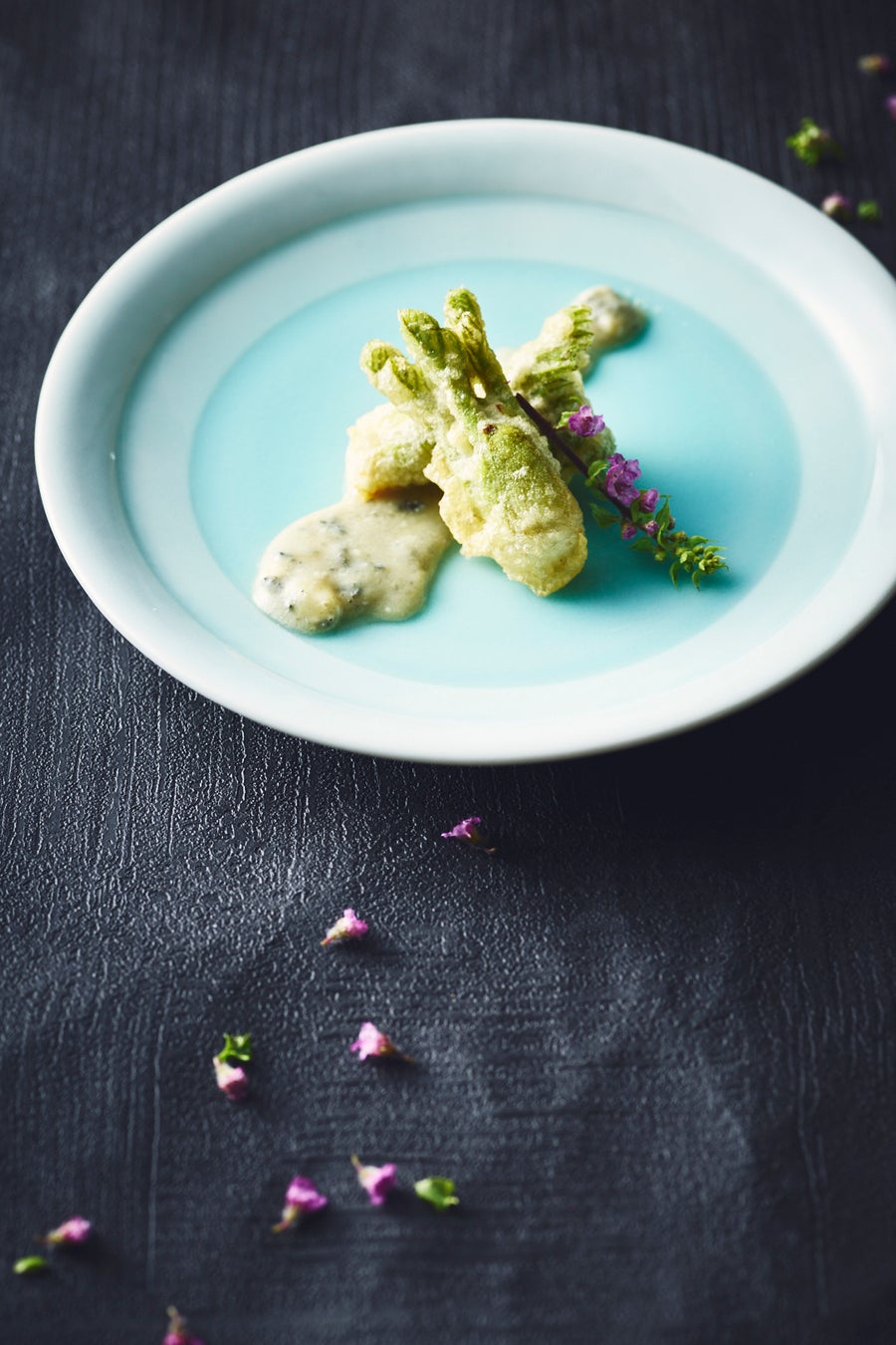 春の王道といえばタラの芽。ほんのり苦く甘味がつづく、ホクホクした食感のタラの芽の天麩羅は、ブルーチーズの塩味とコクが天麩羅とマッチして絶妙なバランスに。