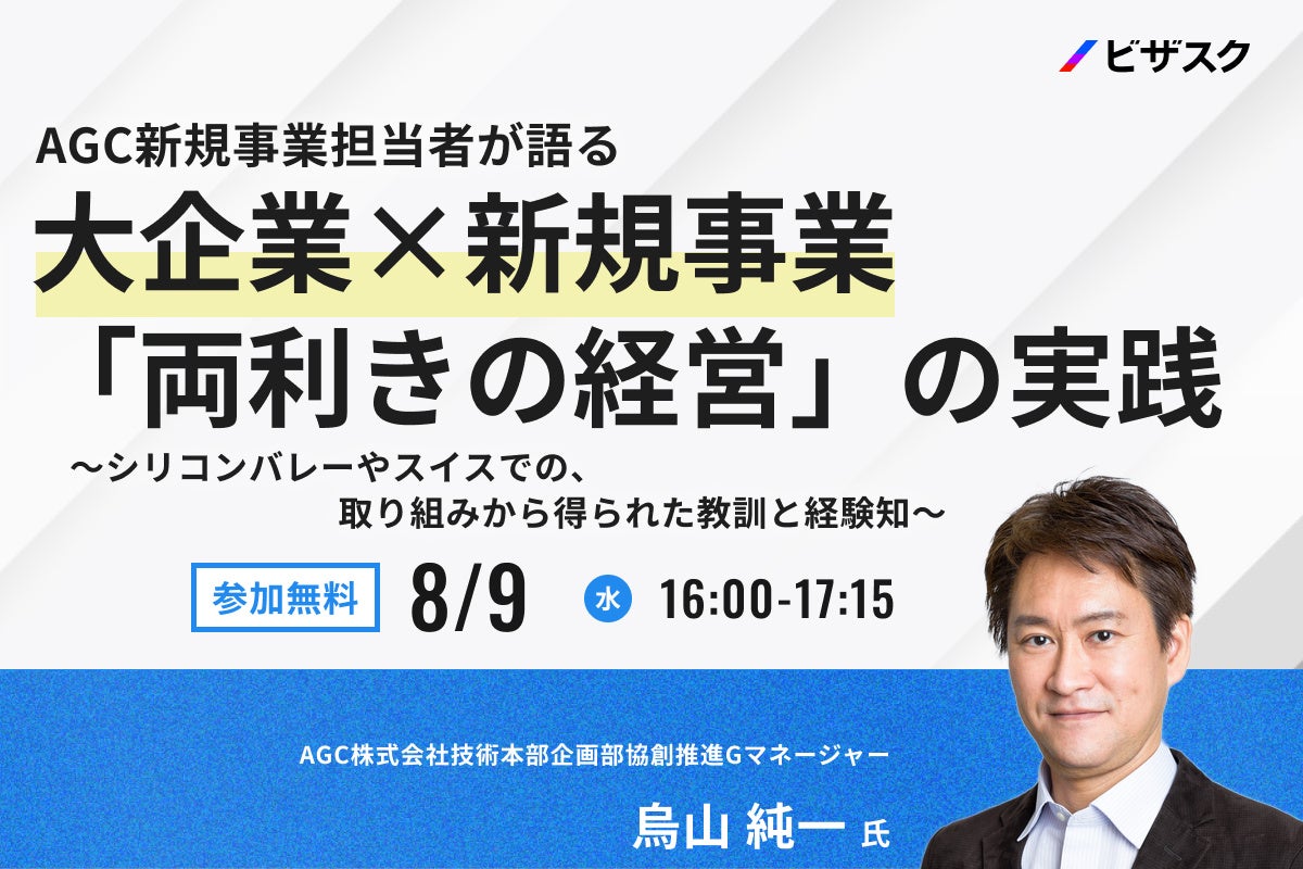 【8/9(水)16時】AGC新規事業担当者が語る 大企業×新規事業 「両利きの経営」の実践〜シリコンバレーやスイスでの取り組みから得られた教訓と経験知〜無料オンラインセミナーを開催