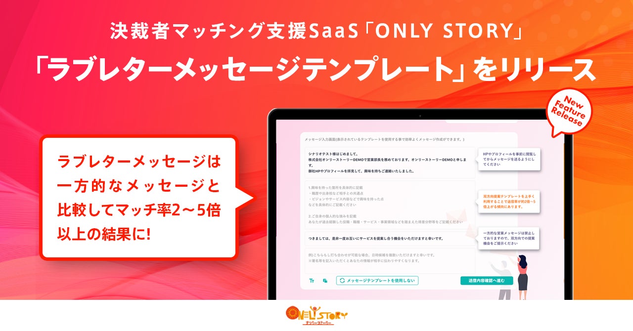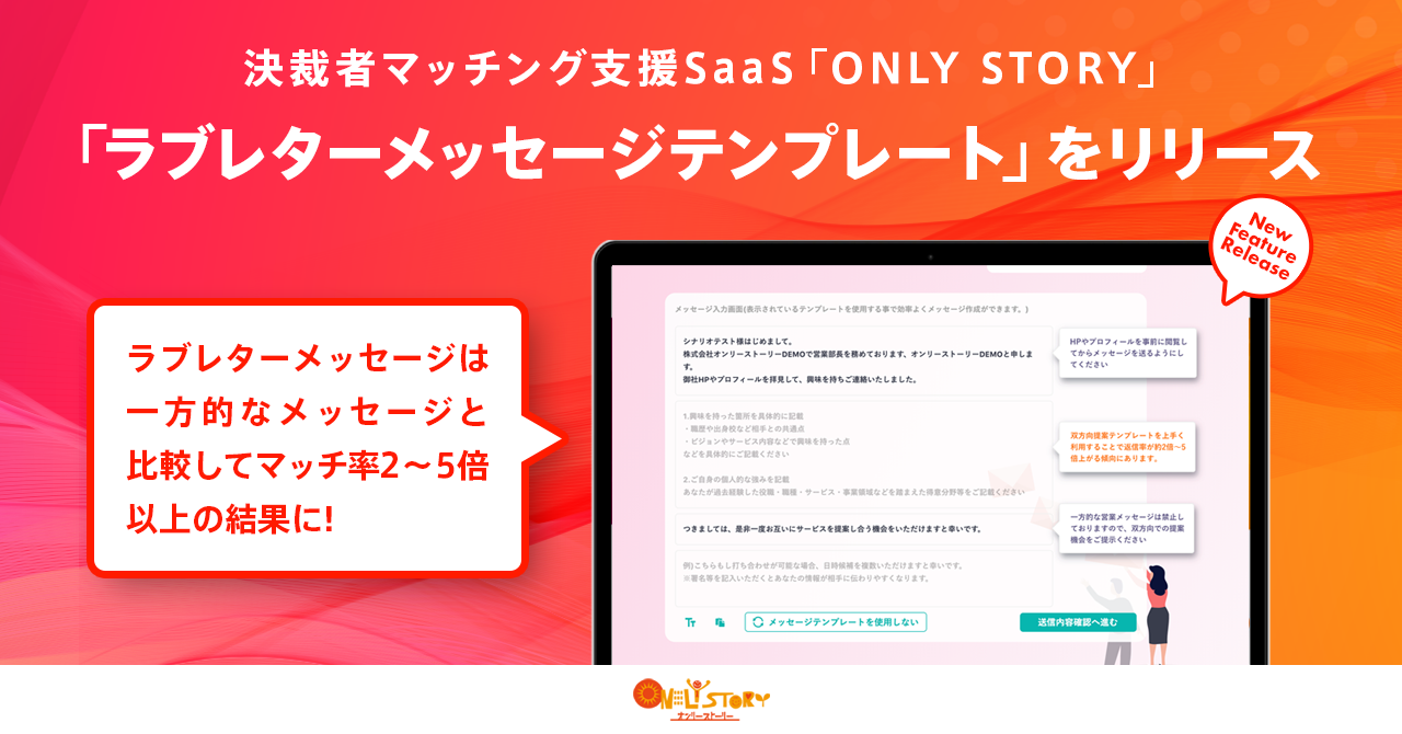 株式会社オンリーストーリーが運営する審査制・決裁者マッチング支援SaaS「チラCEO」「ONLY STORY」は、決裁者マッチングを通じて経営課題を解決するサービスです。6,000を超える決裁者(8割以上が取締役以上の経営層)が登録する独自プラットフォームを基盤とし、「メッセージ機能」「オンラインイベント」「専任CS(カスタマーサクセス)メンバーによる紹介」「掲示板機能」等によって決裁者同士のマッチングを創出します。