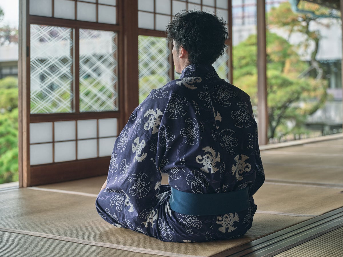 また、江戸時代に藩主へお仕えする方々が着用していた法被をモチーフに、子持筋という模様を裾に配した柄に。色は武家に好まれた色という濃い藍色「褐色(かちいろ)」をお選びいただきました。