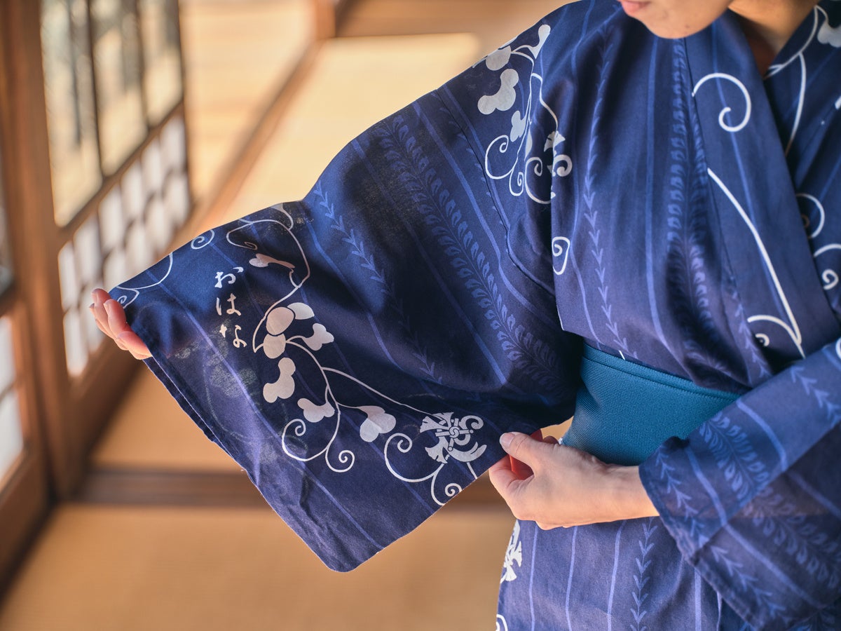 また、ゆかたを着慣れない方にも向けて前幅をやや広めに仕立てています。袖は通常のゆかたよりはやや短めの袂(たもと)で、御花様の以前のゆかたのような筒袖の利便性と、ゆかたらしいゆったりと優雅なシルエットを兼ね備えた仕様にしています。