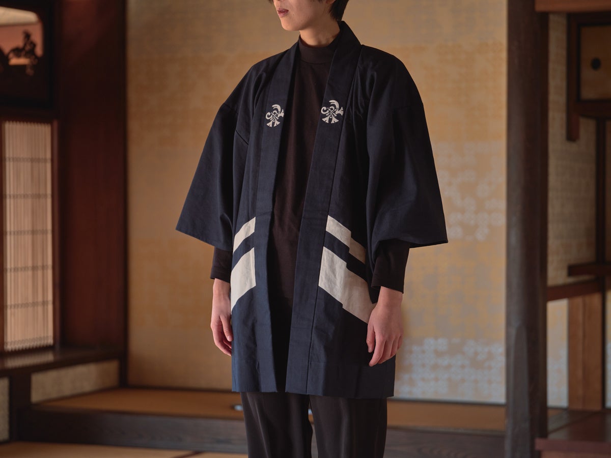武家らしい格調の高さを兼ね備えたブランディングをお手伝いさせていただくため、半纏の仕立てでありながら紋付の羽織に近づけた家紋の入れ方をしています。