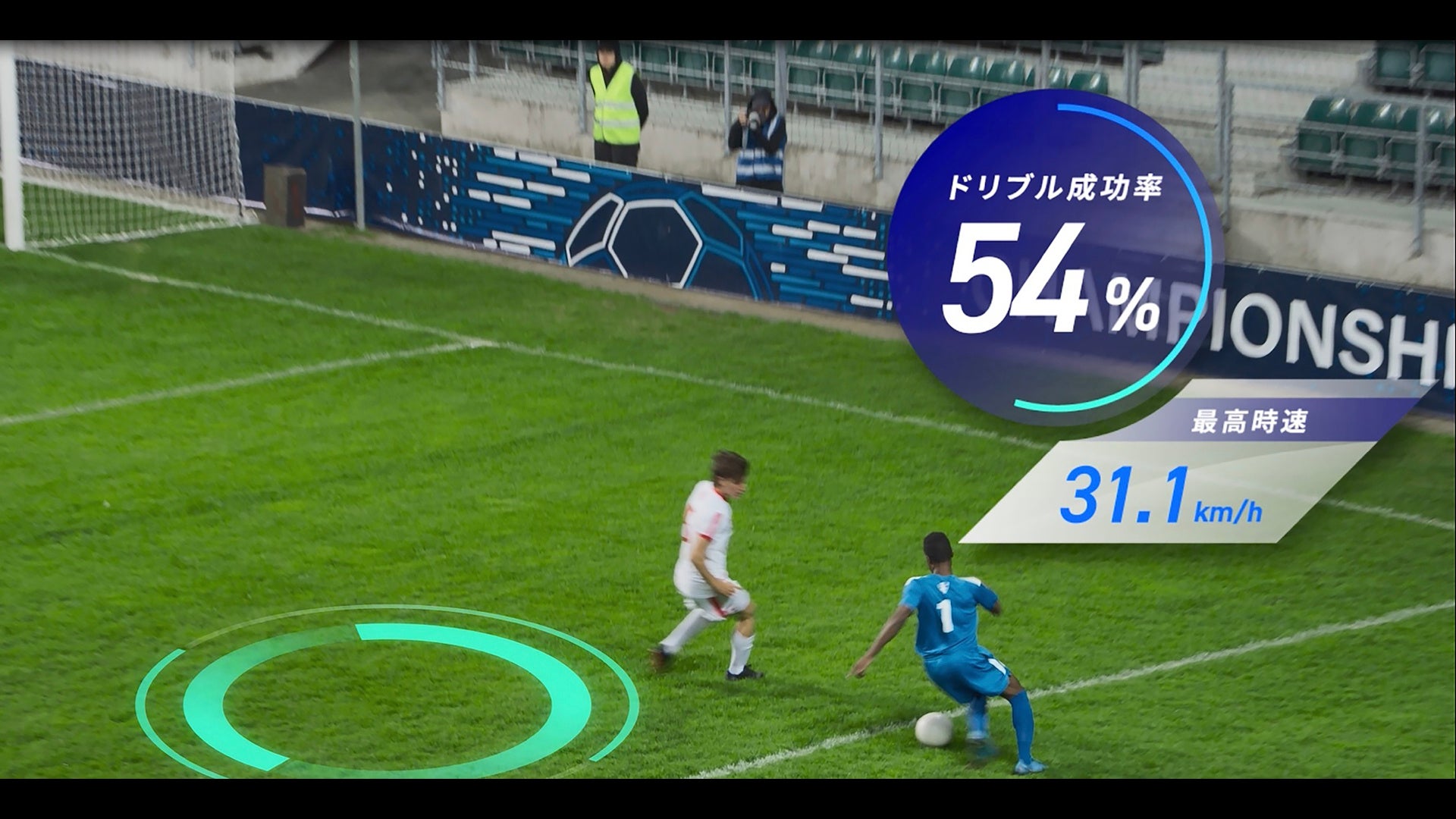 ARグラスを装着してモニターの試合映像を見ると、選手のポジションや身長・体重といった情報が可視化されます。また、ドリブル成功率や枠内シュート成功率など、プレーに関するリアルタイムの情報も見ることができます。視覚的な情報に加え、スタジアム観客席での歓声や声援を立体音響技術で再現し、臨場感のある試合観戦を表現しました。
