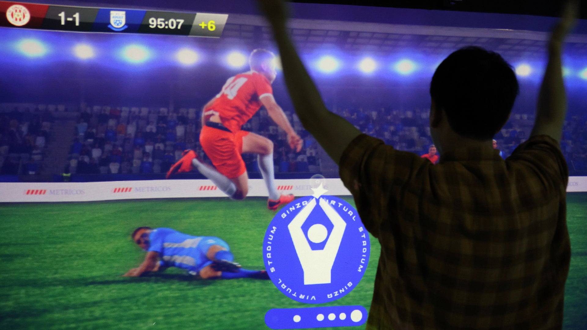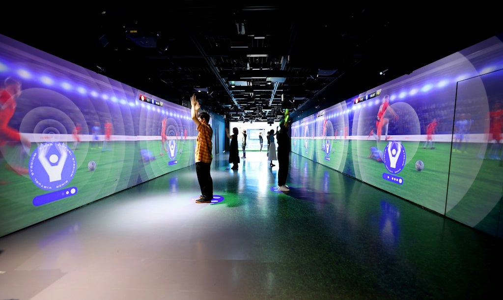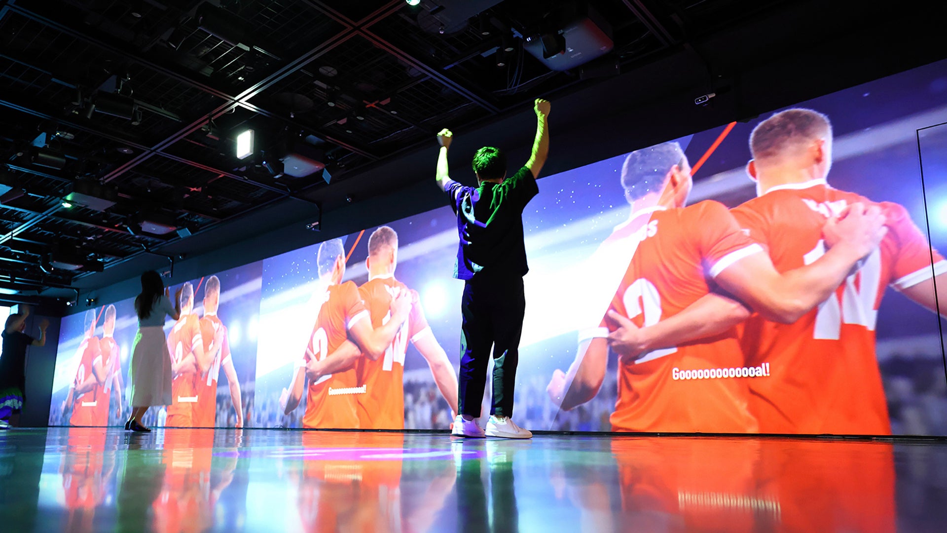 壁3面と床1面が映像に囲まれた、サッカー選手と同じフィールドに立っているようなイマーシブ空間で、身体を動かすと選手への応援の熱量がエフェクトとして映し出される、“新感覚のサッカー応援インタラクティブ体験”が楽しめます。