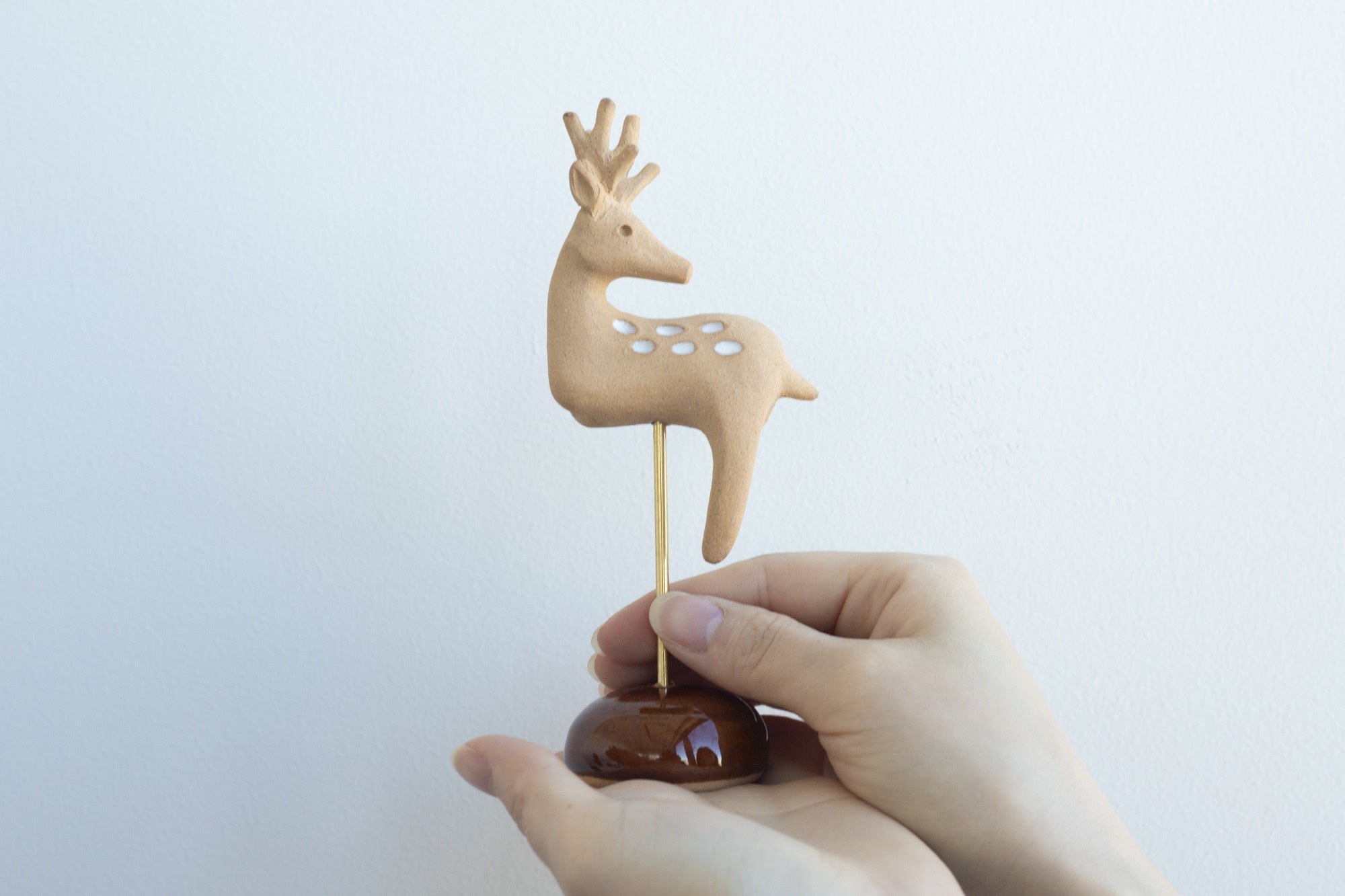 奈良の四条古墳で出土された埴輪をモチーフに作られた赤膚焼きのオブジェ。何を見つめているのか気になる鹿の表情と、現代のインテリアにも合うデザインが魅力です。