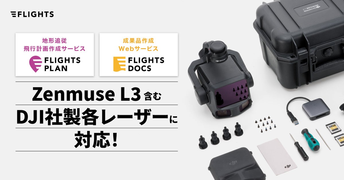 株式会社FLIGHTS(本社:東京都渋谷区、代表取締役:峠下 周平、以下:FLIGHTS)は、本日11月4日(火)にDJI JAPAN株式会社より発表・発売されました、ドローン(UAV)レーザー「DJI Zenmuse L3」に、以前よりドローンレーザーによる公共測量を行う事業者様にご好評いただいておりますFLIGHTS独自のソフトウェア、地形追従飛行計画作成サービス「FLIGHTS PLAN」と成果品作成Webサービス「FLIGHTS DOCS for UAV」をDJI Zenmuse L3を含むDJI Zenmuseシリーズ向けに開発したことをお知らせいたします。