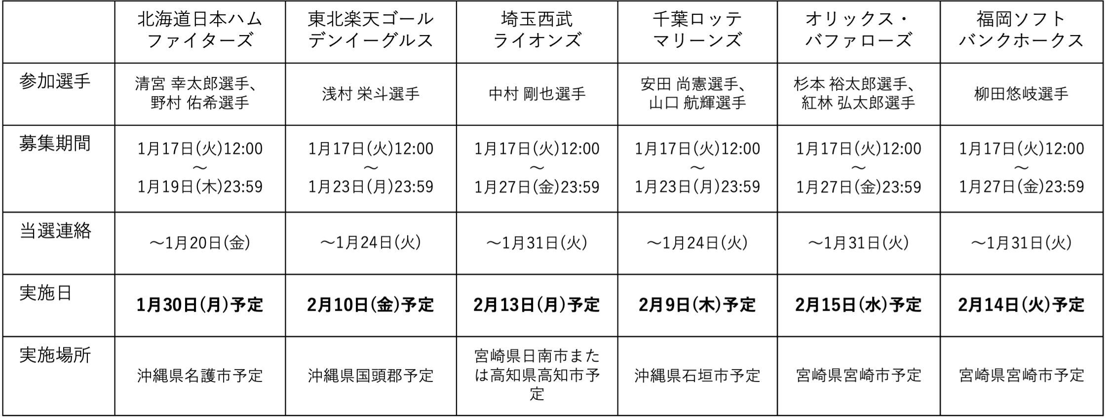 ・募集期間:球団ごとに異なります。下記球団ごとの情報をご確認ください。