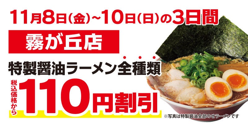 この度リニューアルオープンを記念して、「霧が丘店」にご来店いただいたお客様には、『特製醤油ラーメン全種類』を税込価格から110円割引で販売いたします。