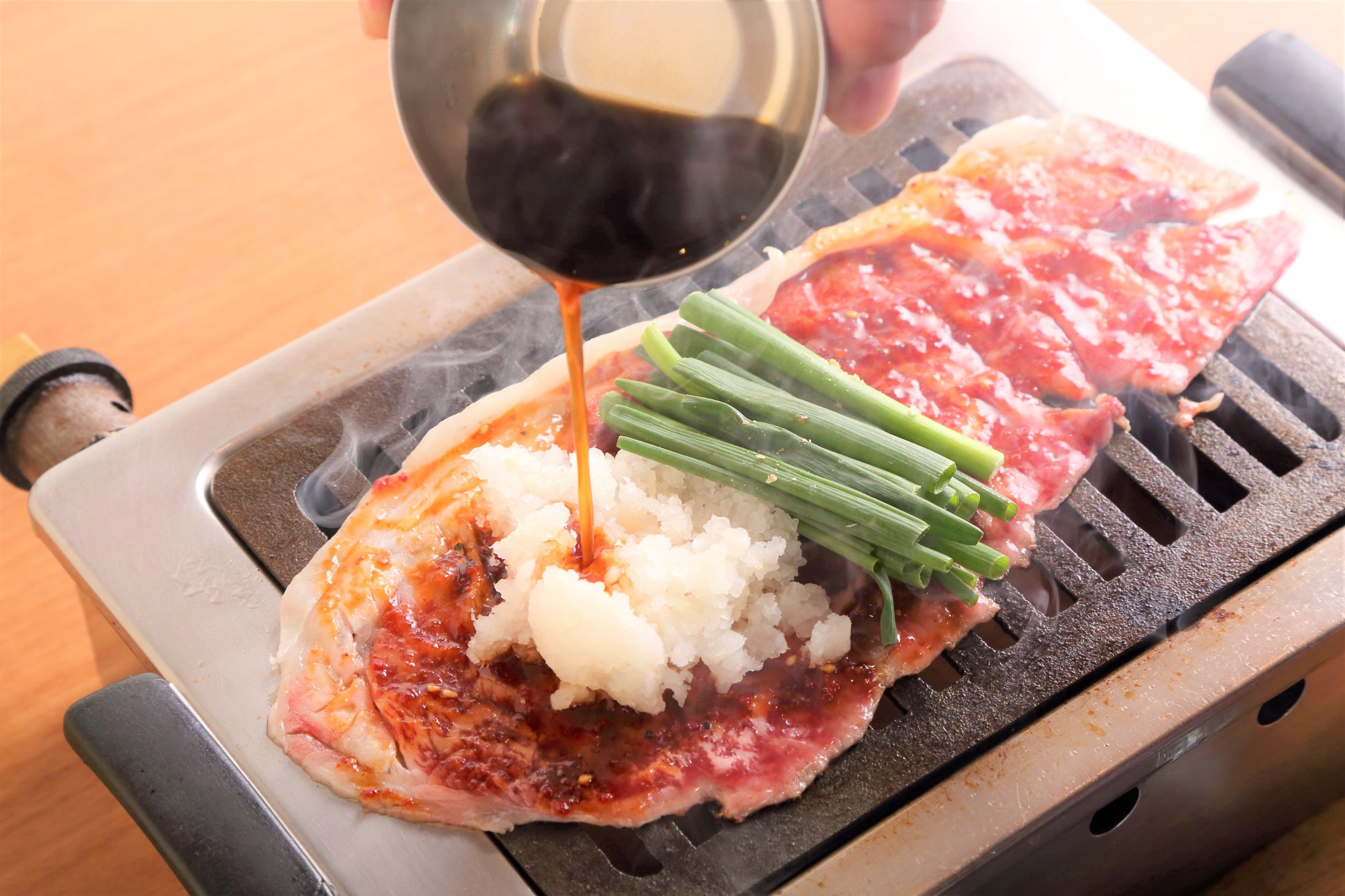 はみ出るカルビに続く、初代肉フェスチャンピオンに輝いたふたごの二代目名物メニュー。A5ランク黒毛和牛にネギと大根おろしをたっぷり乗せ、ポン酢をかけてくるっと巻きます。