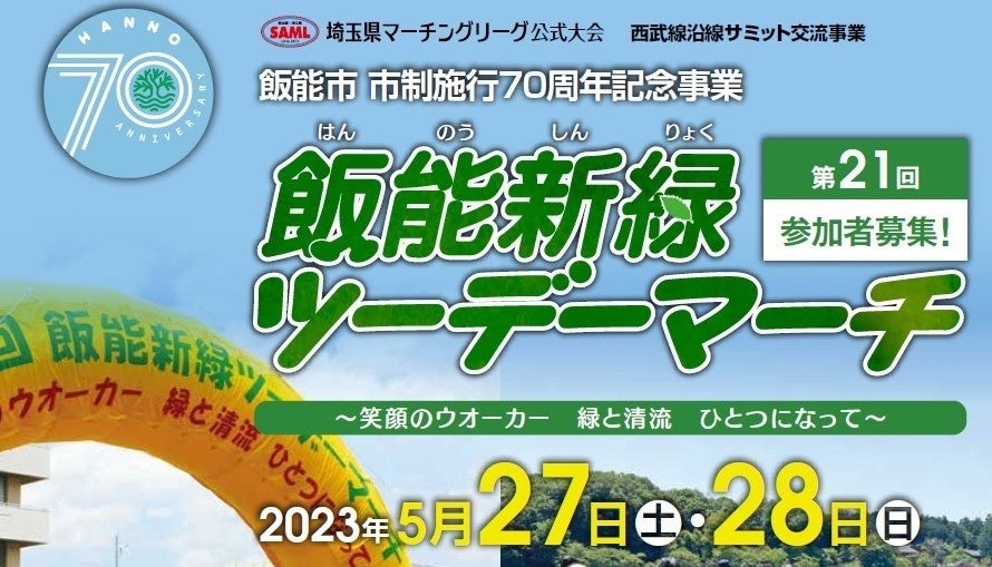 第21回飯能新緑ツーデーマーチ https://www.city.hanno.lg.jp/soshikikarasagasu/kyoikubu/sportska/7070.html