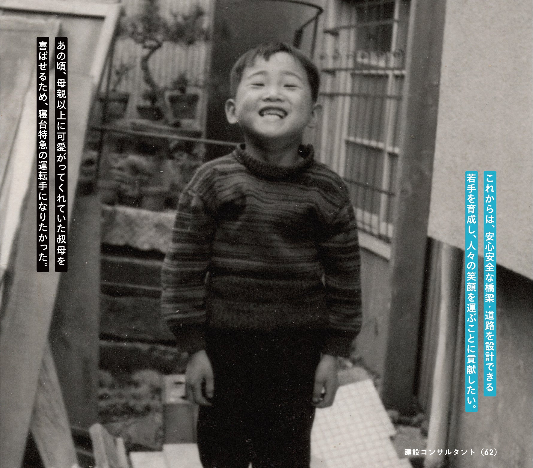 正に、50年以上も前から抱いていた『電車の運転士になって人々の安心・安全そして笑顔を運ぶ』という夢が、安心・安全な橋梁、道路を設計することにより、人々の笑顔を運ぶという私の夢に繋がっております。正に夢が叶えられつつあります。まだ夢半ばですが、残りの人生を私の50年来の夢の実現に向けて、邁進して参りたい所存です。