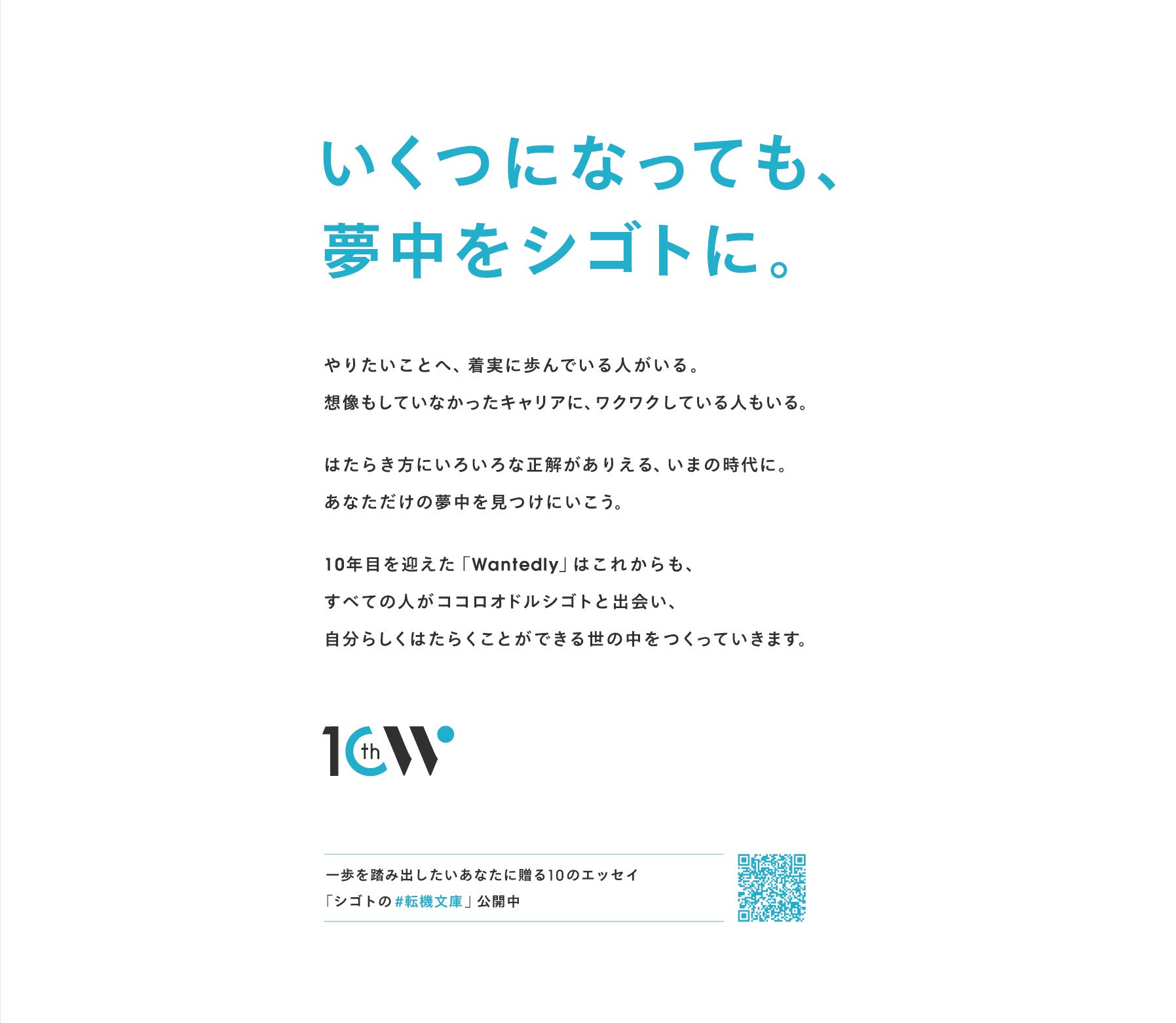 ウォンテッドリーは、企業の潜在転職者への認知形成、共感を軸とした人と企業の出会いの創出を提供しながら、入社後の従業員の定着、活躍を支援するエンゲージメント事業を推進しています。今回のWantedlyの10周年を契機とした取り組みを通じて、Wantedlyが「はたらくすべての人のインフラ」となる世界の実現を加速させてまいります。