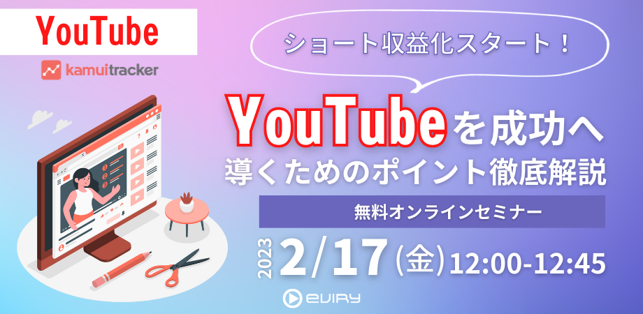株式会社エビリー(本社:東京都渋谷区、代表取締役社長:中川恵介、以下エビリー)は、2023年2月17日(金)に「ショート収益化スタート!YouTubeを成功へ導くためのポイント徹底解説」と題した無料オンラインセミナーを開催いたします。