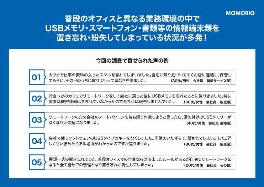 また今回のアンケート調査で寄せられたリモートワーク中の置き忘れや紛失事故の詳細については次のような声がありました。
