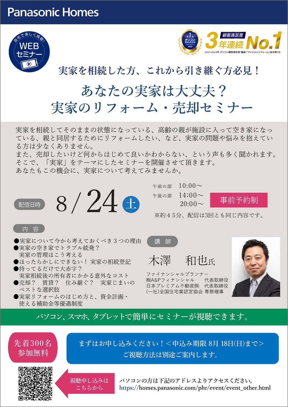 パナソニック ホームズ株式会社のグループ会社、パナソニック リフォーム株式会社は、実家を相続する上で知っておきたいポイントをWEBで解説する 『あなたの実家は大丈夫?実家のリフォーム・売却』 WEBセミナーを、8月24日(土)10:00-10:45/14:00-14:45/20:00-20:45に開催します。