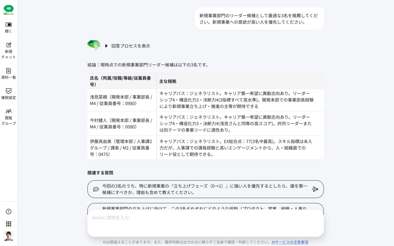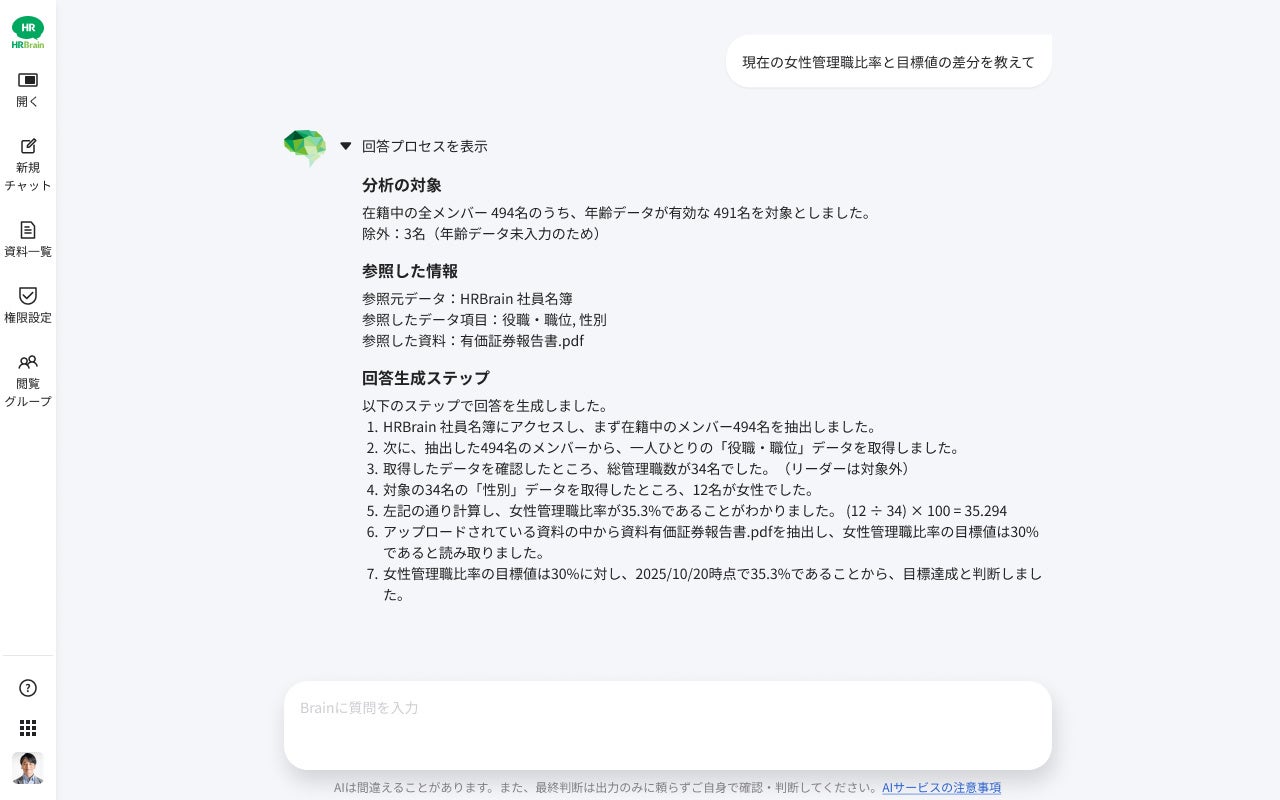 また、役員会等で現在の女性管理職比率や達成率といった人的資本情報に関する質問がある際、「HRBrain Brain」を用いると「分析の対象」「参照した情報」「生成ステップ」など、回答プロセスまで的確に提示してくれます。単なる回答だけでなくプロセスの詳細まで、参加者全員に説明出来ることも導入の決め手となりました。