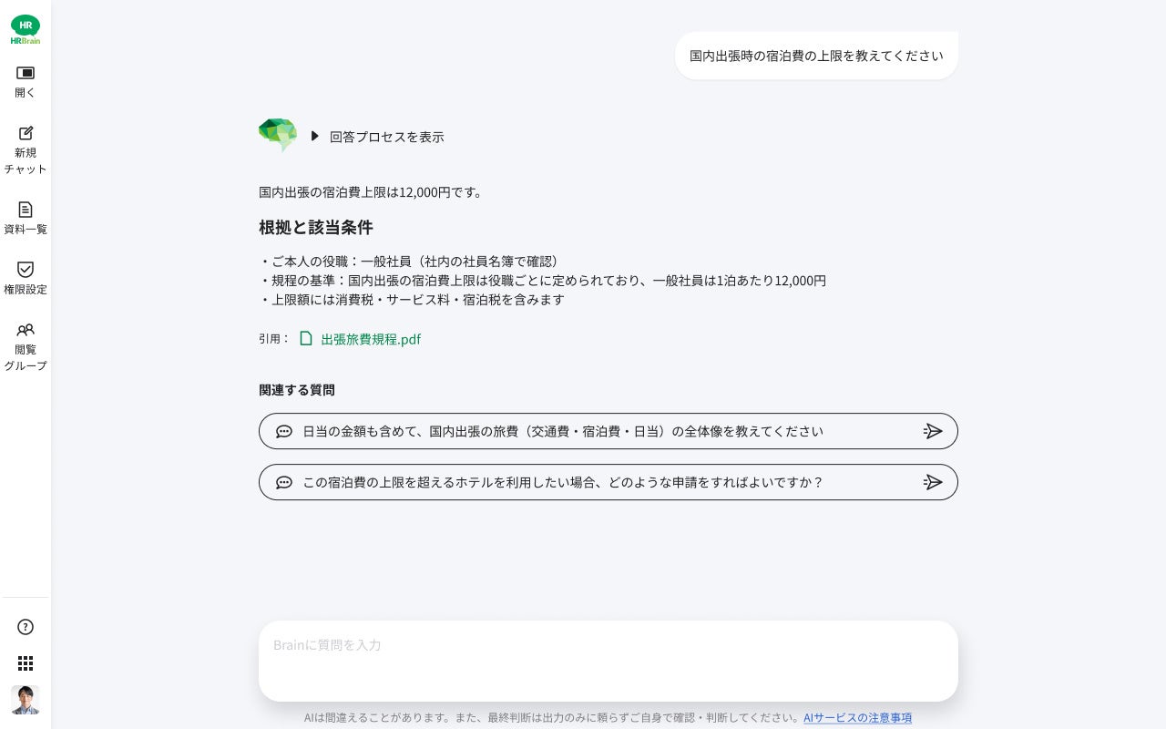 質問者の「等級・役職・所属」などの属性をAIが名簿情報に基づきリアルタイムに把握。例えば出張精算の質問に対し、全社規定の中から「その社員に適用される宿泊上限額」をピンポイントで回答します。