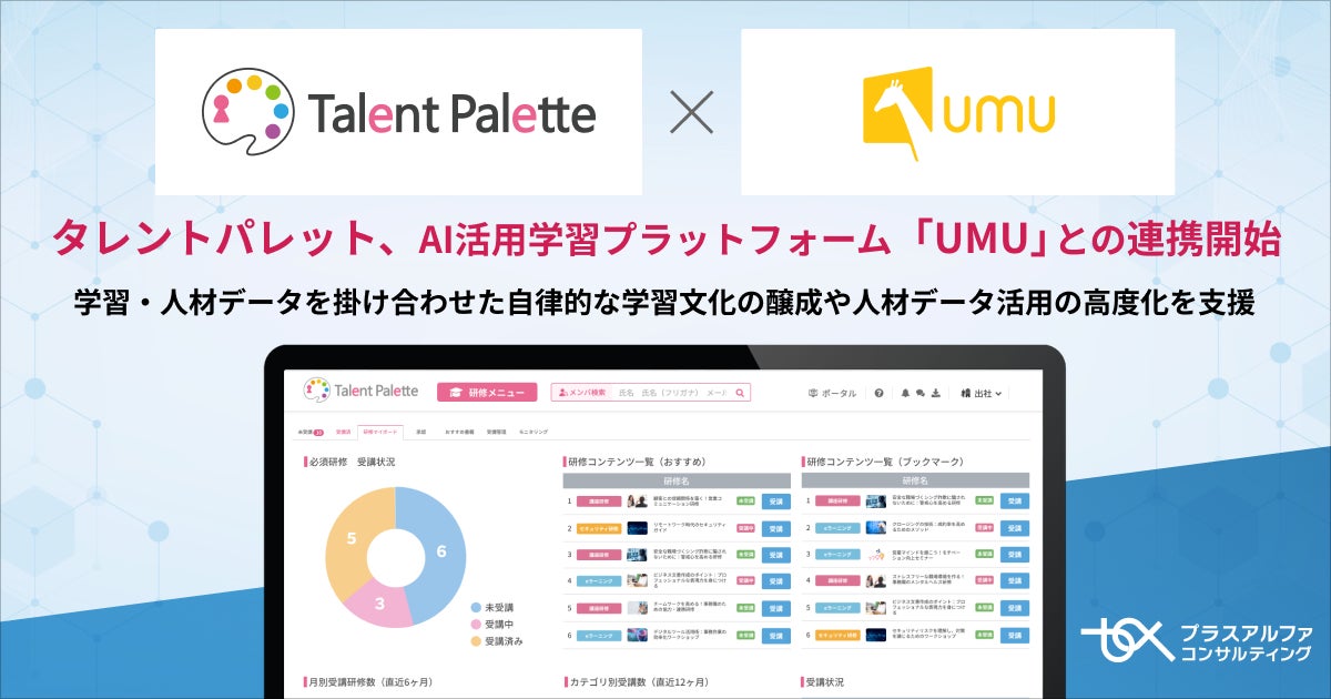 株式会社プラスアルファ・コンサルティング(本社:東京都港区、代表取締役社長:三室 克哉、証券コード:4071、以下:PAC)は、人手不足・採用難、リスキリングの必要性、離職防止などを背景に、多くのエンタープライズ企業で導入が進んでいるタレントマネジメントシステム「Talent Palette(以下:タレントパレット)」において、AI活用学習プラットフォームを提供するユームテクノロジージャパン株式会社(本社:東京都新宿区、代表取締役 松田 しゅう平、以下「UMU」)と業務提携を開始しました。
