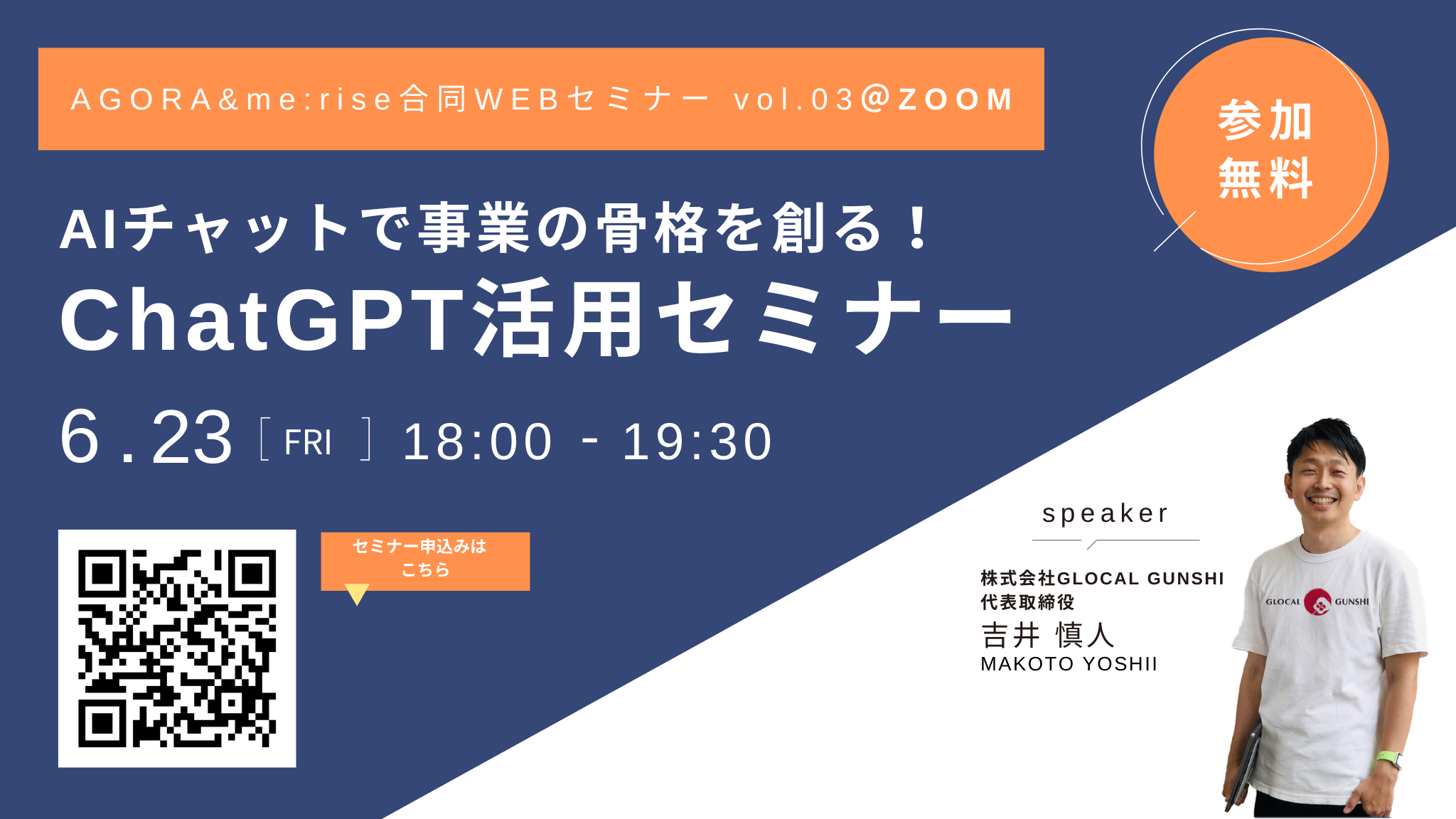 コワーキング&シェアオフィスBUSO AGORAでは、2023年6月23日(金)に「AIチャット」をテーマにして創業支援セミナーをWEB開催します。登壇者には株式会社GLOCAL GUNSHI 代表取締役 吉井慎人氏(AGORA Hon-atsugiインキュベーションマネージャー)をお招きし、これから起業する方・新規事業の立ち上げを考えている方へ向けてお話ししていただきます。