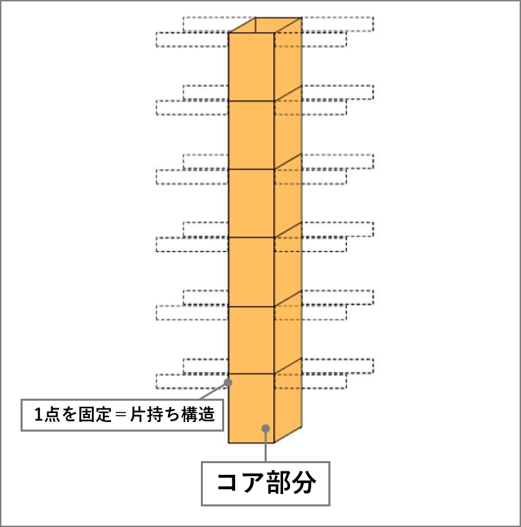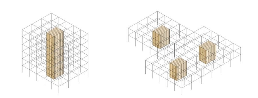 1~3階建ての低層建築向けのオリジナルLC-core構法の『コア』の考え方を活かし、6階建てCLT建築を実現しました。本プロトモデルは、片持ちコア構造を採用し、ひとつのコアにおける負担可能な床面積によって、基本的な設計をシステマティックにできます。