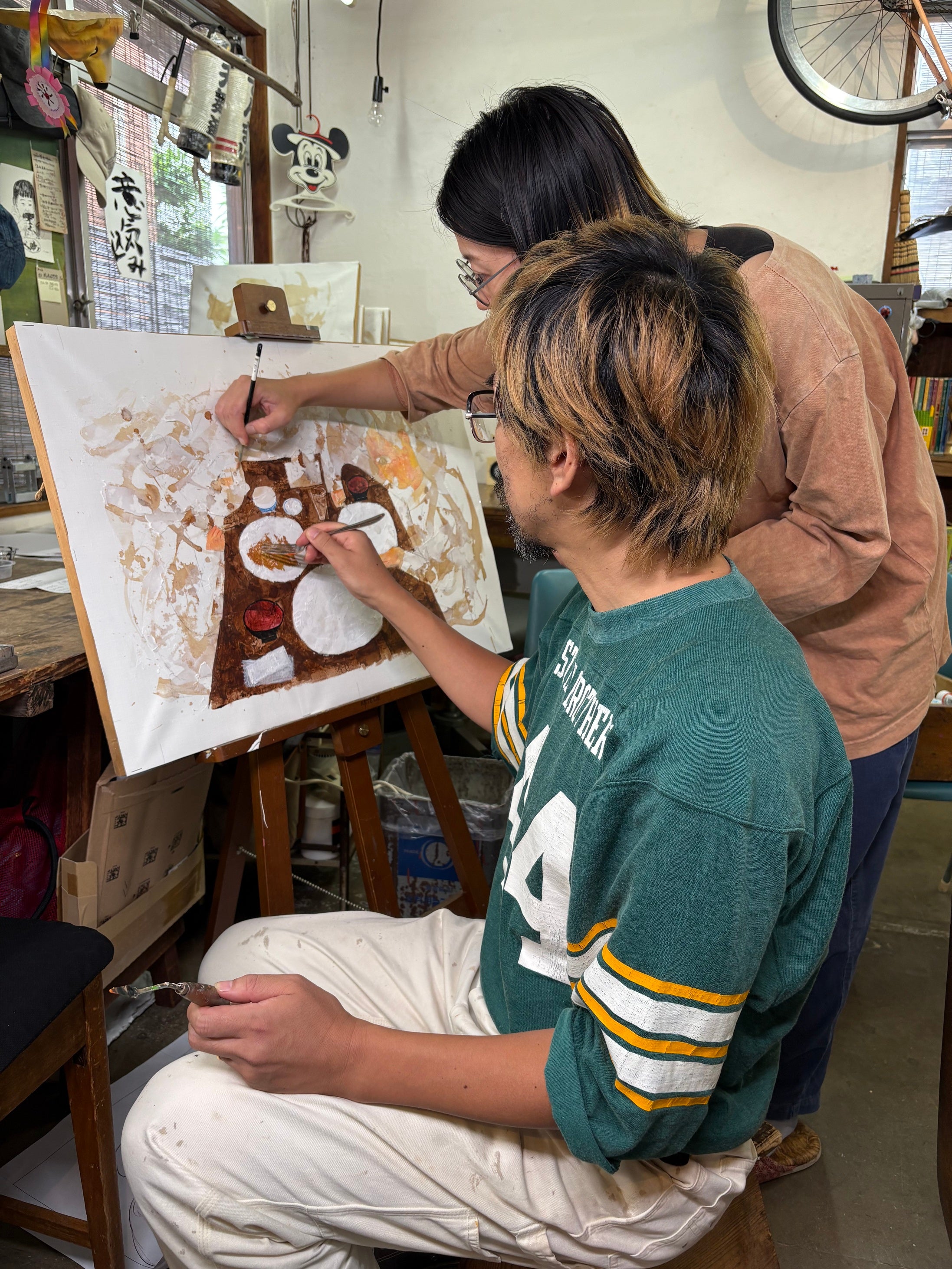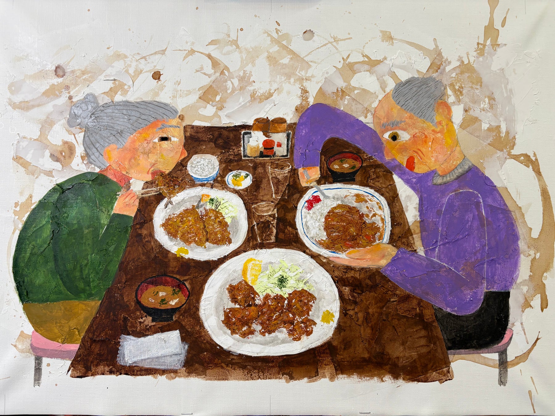 2025年9月、はらぺこめがね・原田しんやさんのInstagramアカウントにて、『しょくどう』原画制作のライブペイントが5回にわたり生配信されました。著者のお二人がイベントで行っているライブペイントの手法を用いて、1回3時間ほどで1枚の原画を制作。ぜんぶで5枚の絵が完成! 配信で見やすいようにと絵本の150%のビックサイズで描かれた絵は、筆跡もよくわかって大迫力です。「かぎられた時間内で集中すると、ふしぎといい絵が描ける」という話からはじまった試みです。