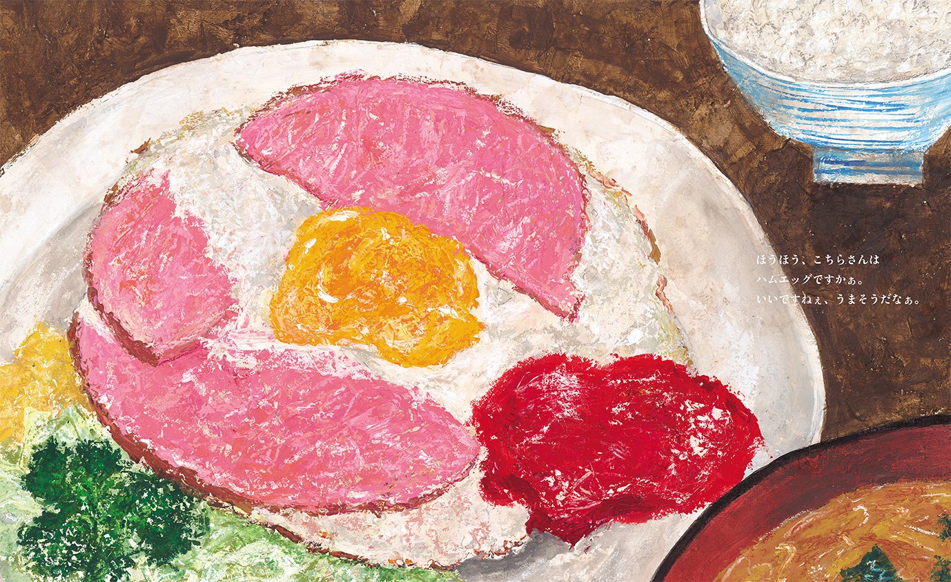 ハムエッグ、しょうがやき、ひややっこ、アジフライ……「たまらん、はらへったぁ。」おもわずよだれがでそうな、おいしそうなメニューがたくさん登場。ラストの種明かしを読めば、もう一度読み返したくなることうけあいの、二度おいしい絵本です。