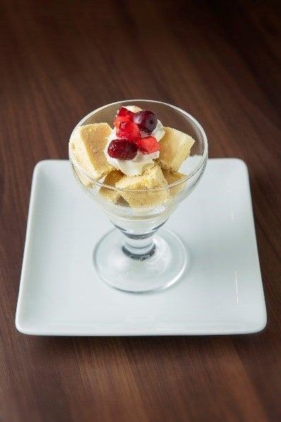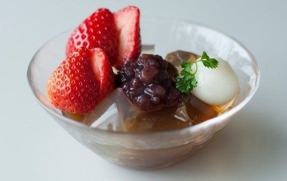 上質なほうじ茶の寒天に福岡県産あまおう、北海道産あずきと白玉を添えました。鈴懸特製シロップをかけてお召し上がりください。