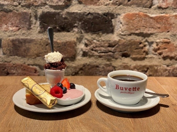 ミニチョコレートムース、焼き菓子、ポットドクレームにオニバスブレンドコーヒーが付いた、フランス式のデザートの盛り合わせです。
