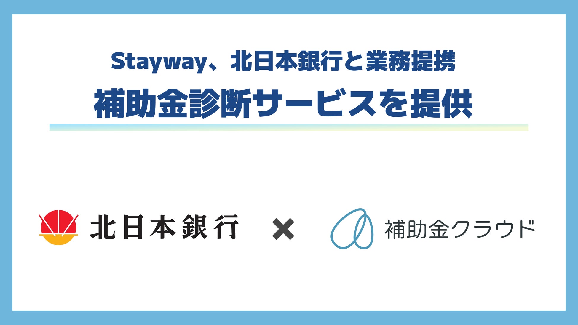補助金支援のDXを通じた経営支援サービス「補助金クラウド」と補助金債権の早期資金化サービス「前ほじょくん」を運営する株式会社Stayway(本社:大阪府大阪市、代表取締役: 佐藤 淳、以下「Stayway」)は、株式会社北日本銀行(本社:岩手県盛岡市、取締役頭取:石塚 恭路、以下「北日本銀行」)と業務提携を開始したことをお知らせします。「補助金診断サービス」の提供を皮切りに、北日本銀行のお客さまに対して補助金・助成金に関する情報提供、相談対応、セミナー提供、申請支援までを一気通貫で支援する、企業の経営課題の解決に向けた協業を開始します。なお、本件は、東北地方の金融機関では初となる取り組みです。