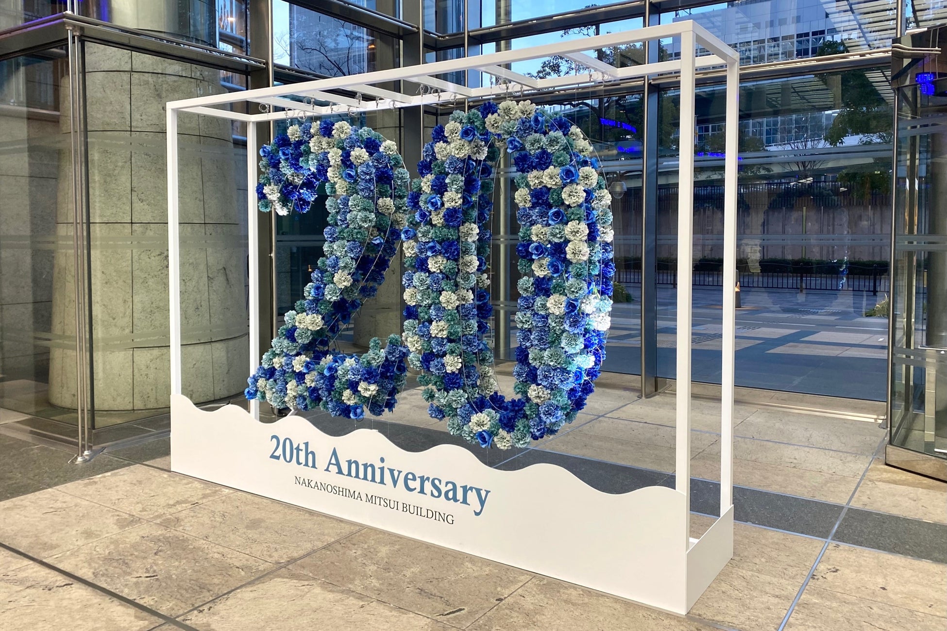大阪府大阪市北区の中之島三井ビルディングは今年で20周年を迎え、ビルのイメージカラー「ブルー」とデザインコンセプトである「VOYAGE」から、青色のアートフラワーをグラデーションにすることで波を表現するデザインを提案しました。