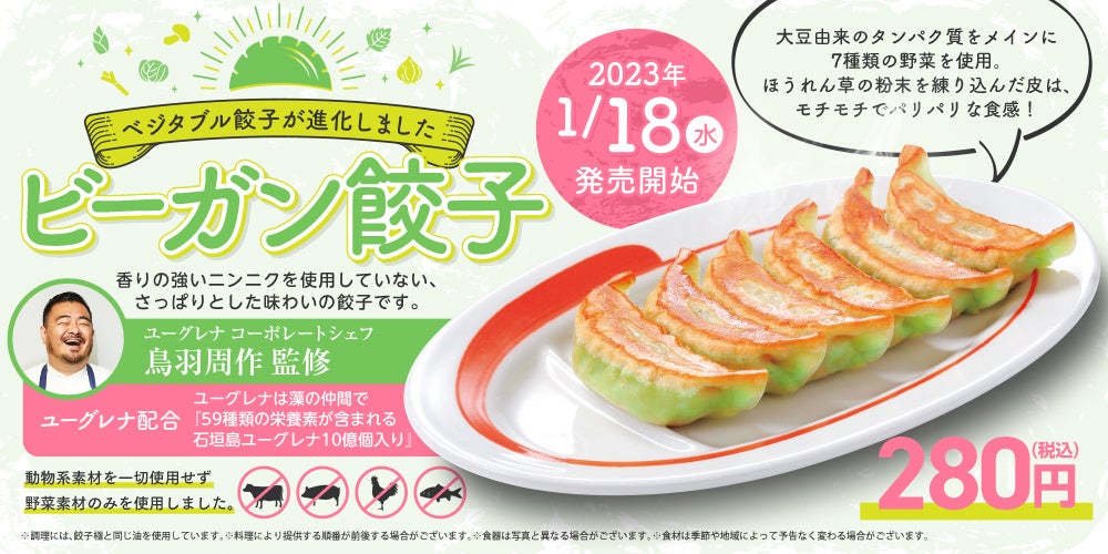 株式会社ユーグレナ(本社:東京都港区、代表取締役社長:出雲 充、以下「ユーグレナ社」)と、株式会社幸楽苑ホールディングス(本社:福島県郡山市、代表取締役社長:新井田 昇、以下「幸楽苑」)は、ユーグレナ社コーポレートシェフ 鳥羽周作氏監修の「ビーガン餃子」を2023年1月18日(水)より発売いたします。