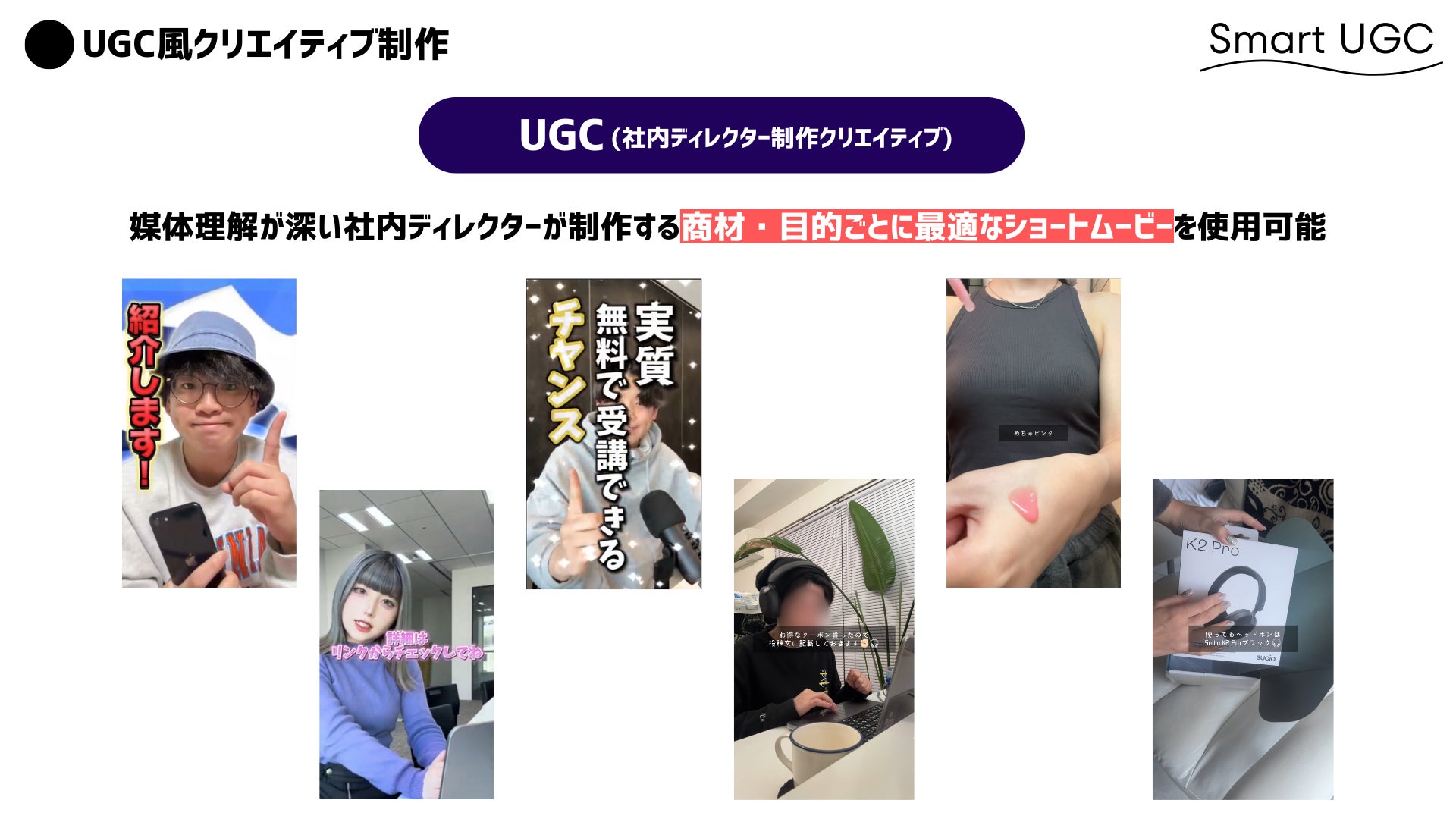 Smart UGCはこのノウハウを活かし、広告効果の再現性とスピードを兼ね備えたパッケージとしてご提供しています。
