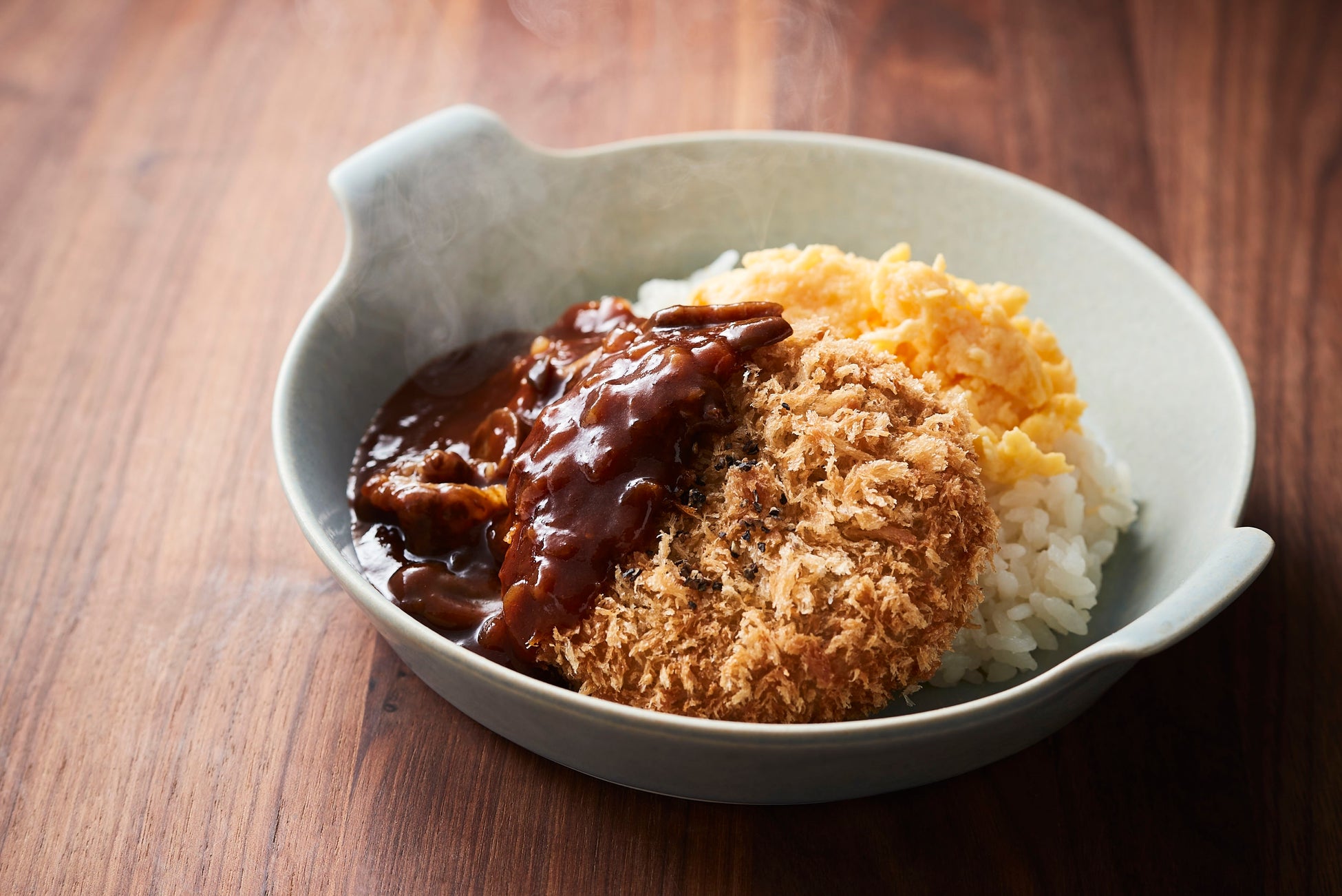 あったかデミグラスソースで食べるビーフコロッケに、バターライスとふわふわ卵を添えて。
