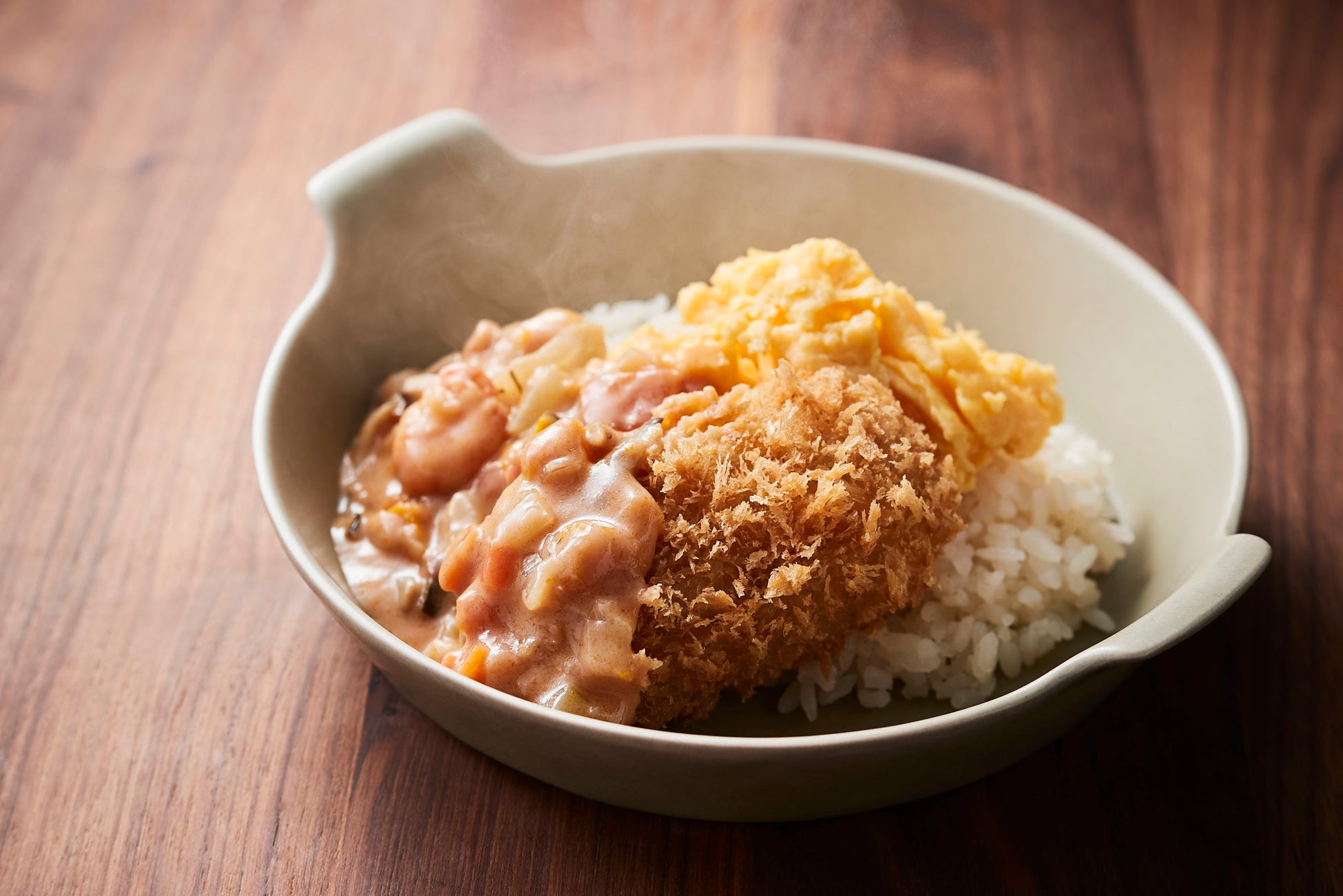 チャウダーソースで食べる蟹クリームコロッケに、バターライスとふわふわ卵を添えて。
