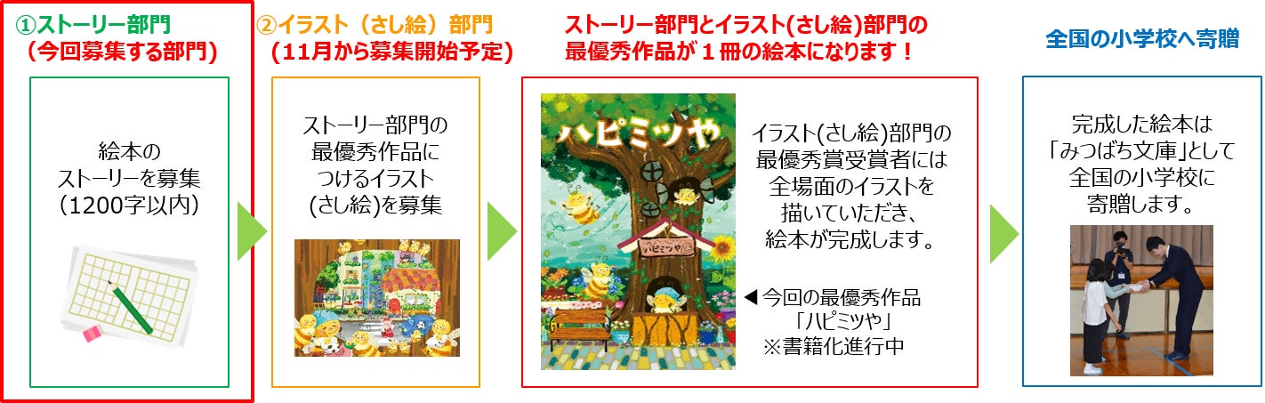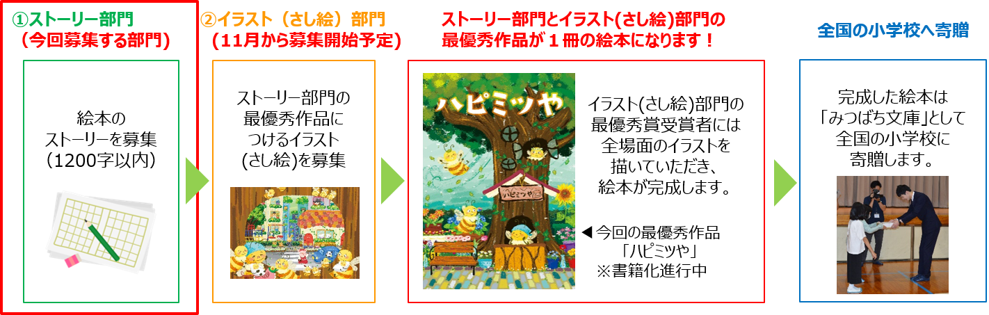 当コンクールではまず、絵本のストーリー作品を募集します。その後、ストーリー部門の最優秀賞に選ばれた作品の内容に合わせたイラスト(さし絵)を募集する2段階形式で行います。