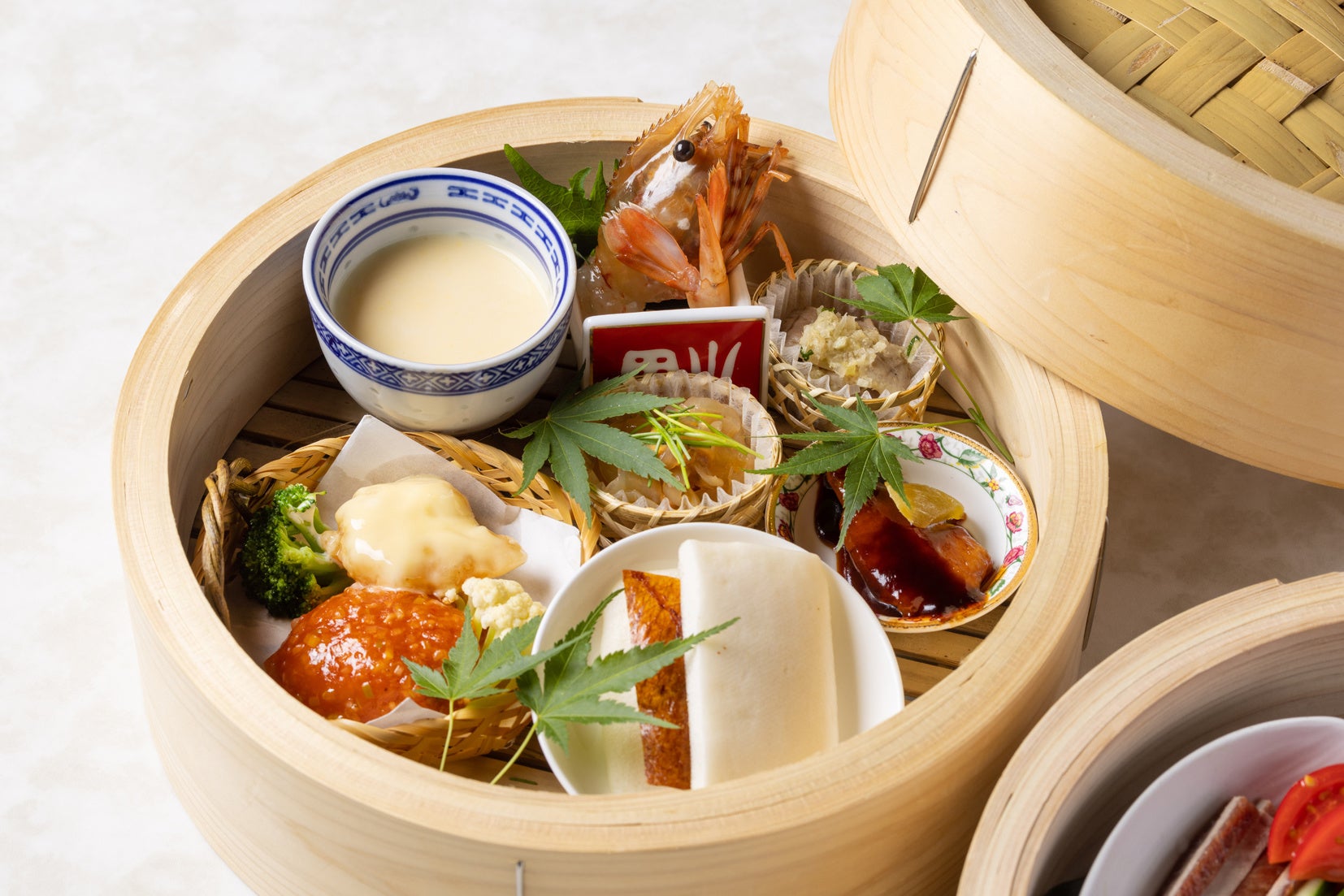 北京・上海・四川・広東の中国4大料理など10種類の前菜を大きなセイロに詰め込んだ豪華な「宝龍冷麺」は、ボリューム満点ながらもさっぱりとお召し上がりいただけるメニューです。北京ダックやエビチリ、ボタン海老の紹興酒漬けなど、少しずつさまざまな味をお楽しみいただけるのが特徴です。食欲が落ちてしまうことの多い暑い夏でも、ホテルの豪華な冷麺で涼やかなひとときをお過ごしいただけます。