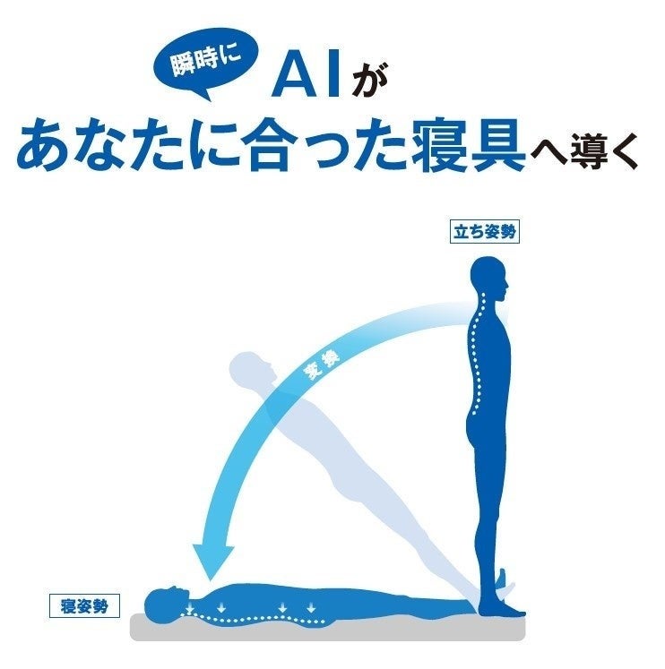 立ち姿勢を寝姿勢に変換する独自の仕組みと、AI判定を組み合わせた最先端の測定システム。立っている時と寝ている時では体の姿勢が異なるため、立った状態で測定し、それを瞬時に寝姿勢に変換することがこのシステムの最大の特徴です。測定データはAIによって瞬時に分析され、個々の体型にぴったり合ったマットレスとまくらを自動で判定し、最適な寝具を提案します。