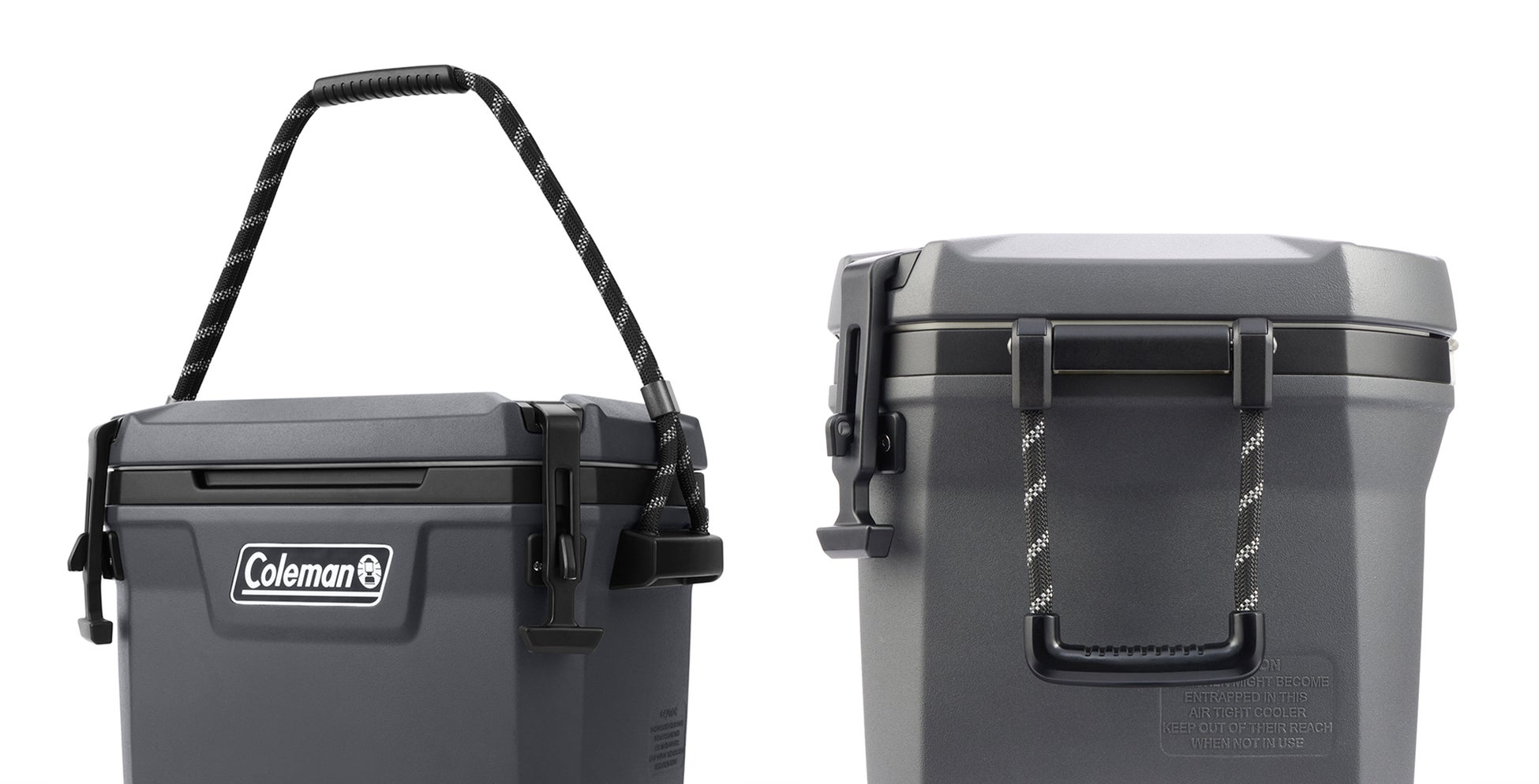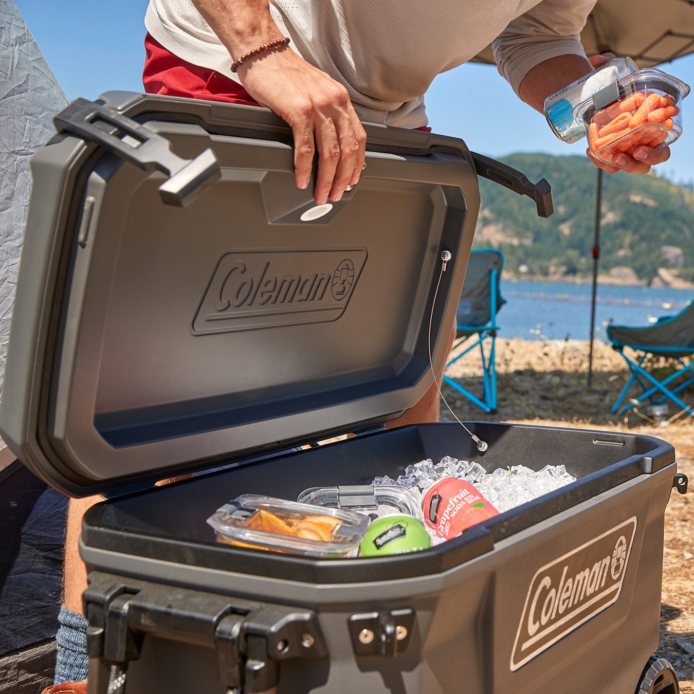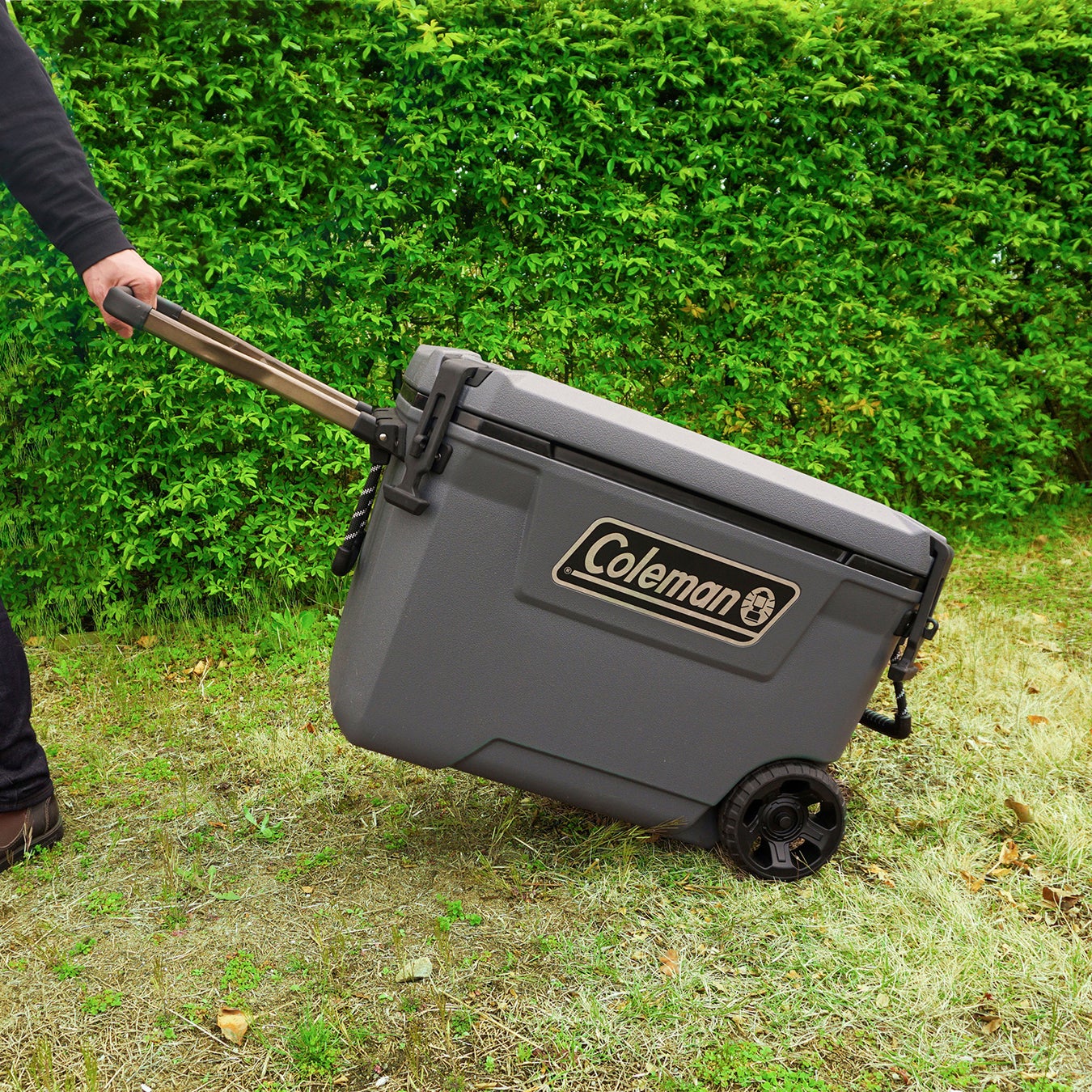 食材やドリンクを入れたクーラーボックスは重くなり、持ち運びしづらいのがネック。コンボイシリーズは滑りにくく、手のひらも痛くなりづらいグリップ付きのロープストラップが付いているため、駐車場からサイトなどへの運搬も楽々です。また、最大容量の65QTモデルにはホイールも付いているため1人での持ち運びも可能です。