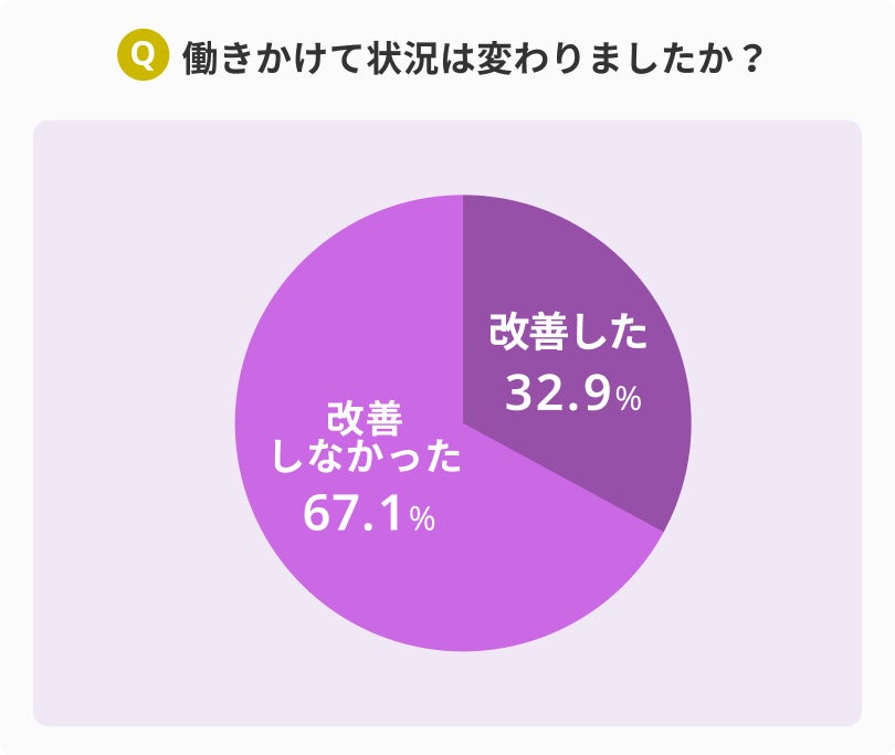 続いて、養育費を受け取れなかったため何らかの形で働きかけをした女性88人に対して、「働きかけて状況は変わりましたか?」と質問したところ、「改善した」と回答した方は32.9%に留まる結果となりました。
