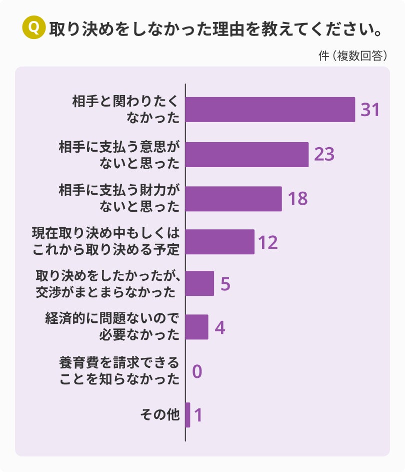 続いて、養育費について「取り決めをしなかった」と回答した61人に対して、「取り決めをしなかった理由を教えてください」と質問したところ、31人が「相手と関わりたくなかった」と回答。次点では23人が「相手に支払う意思がないと思った」と回答しています。